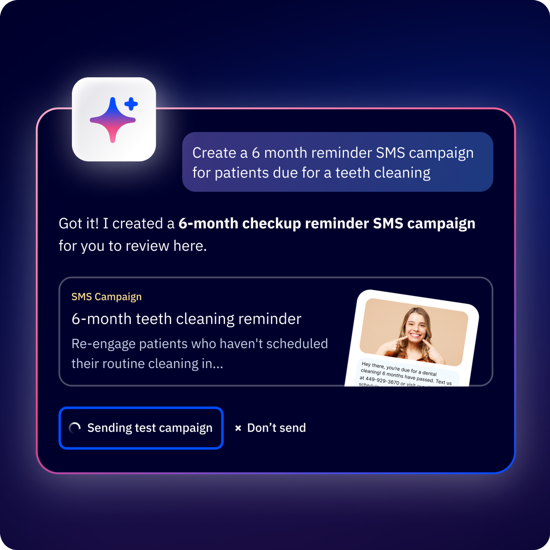 Active Intelligence plans and executes SMS campaigns, generates on-brand content, suggests personalized replies, and summarizes text conversations so your team can achieve more with less.