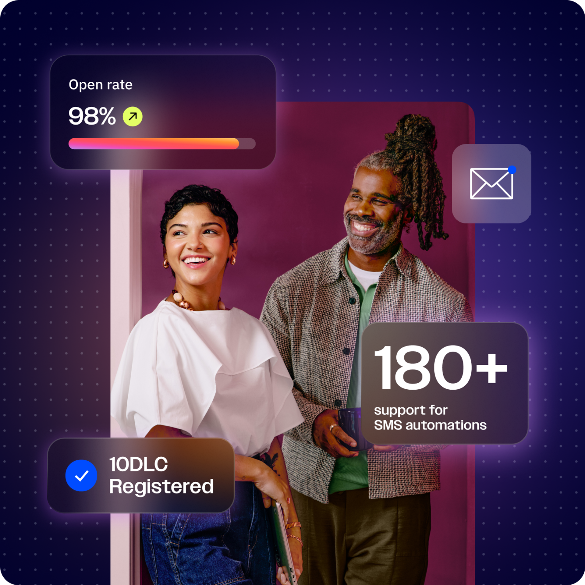 Get a dedicated 10-digit long code through easy, in-app registration that protects your number from being flagged as spam. Send broadcast campaigns in key markets and deliver SMS automations to 180+ supported countries worldwide.