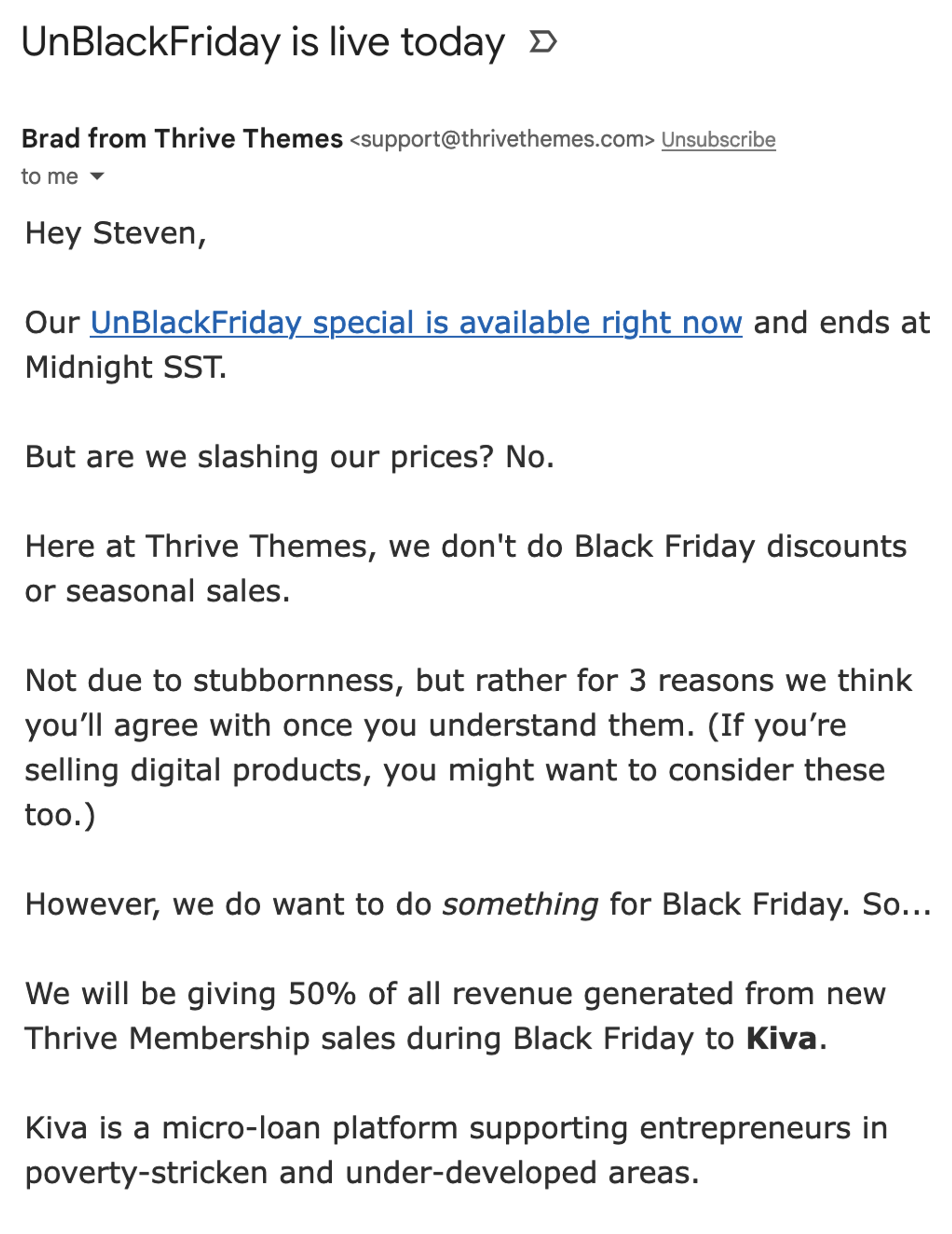 Maybe Black Friday sales go against your business model. In this example, ActiveCampaign customer Thrive Themes shares their “UnBlackFriday” special.