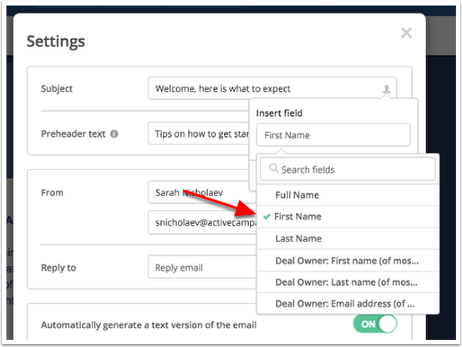 Note: As shown above, you can use personalization tags to use a recipient's first name, location, and other personal details. If you're sending an email to many people, ActiveCampaign can help you dig even deeper and build a relationship by personalizing more aspects of the email sequence.