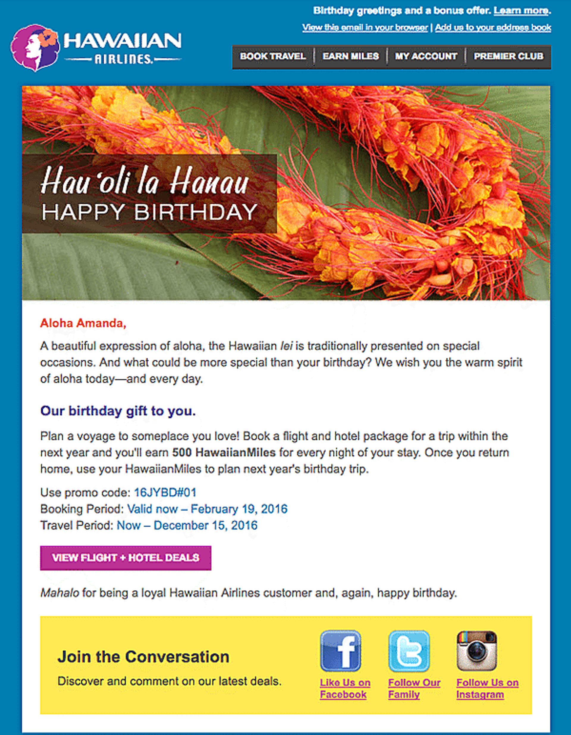 Or you can use relevant dates, like birthdays, as a way to personalize your message.Hawaiian Airlines nails this tactic in a personalized birthday email where they offer you a birthday gift of 500 airline miles if you book a flight within the year: