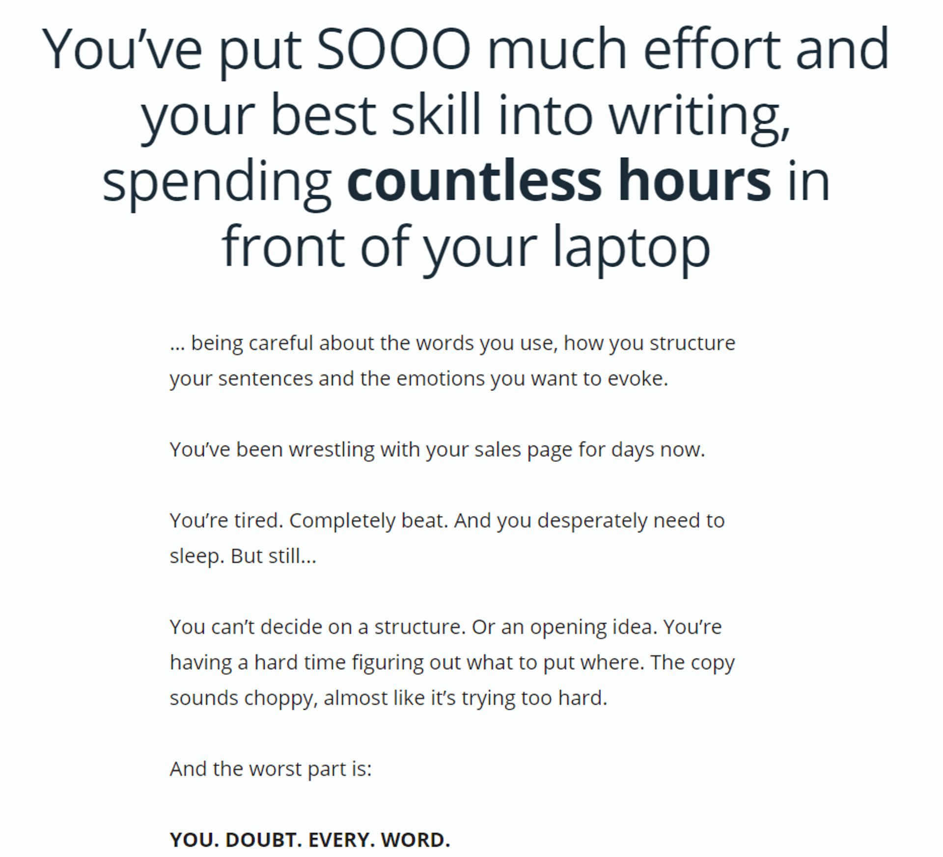 Pretty vivid, right? The copy continues to describe their audience’s sense of urgency and emotional state throughout the remainder of the page.And if there’s ever an example you want to follow, it’s that one.In sum: If a visitor interacts with content marketing that’s further up the funnel, write your copy so that it identifies the pain points in that particular awareness stage — just do it last.It is, after all, the furthest from the sale. If you want to see the most gains as quickly as you can, start at the bottom of the funnel, then tweak, tweak, and tweak again as you work your way up to the top.