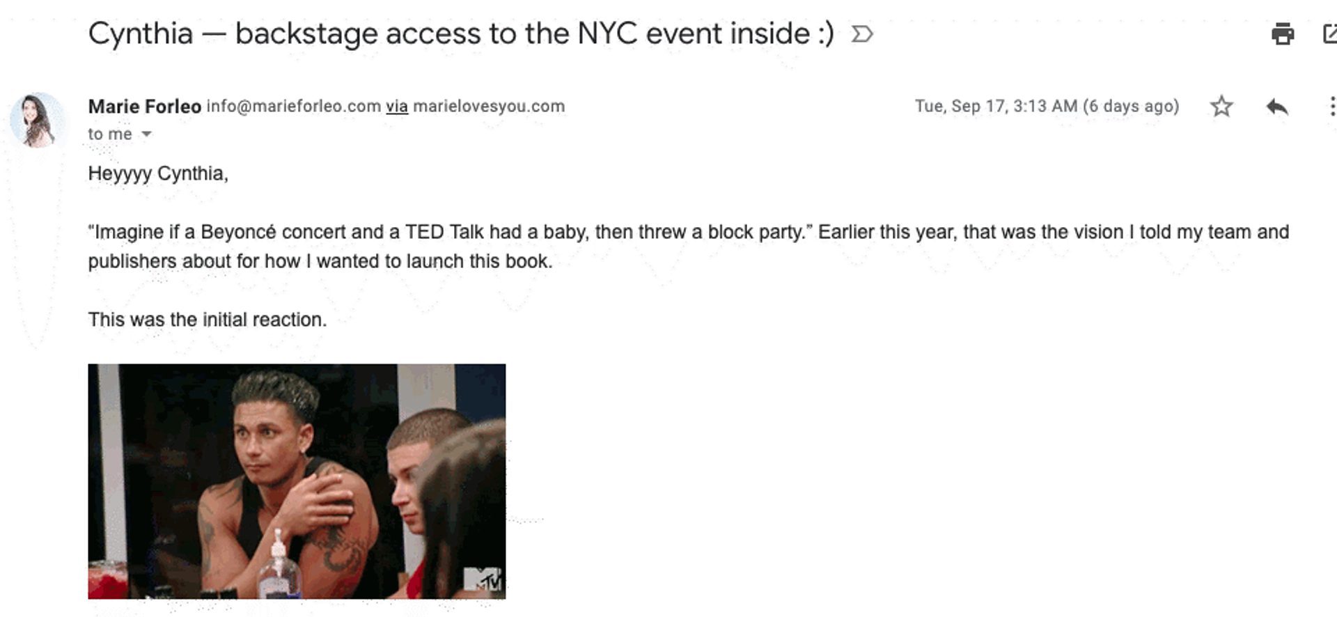 To personalize your message, try using specific details from your recipient’s life. The simplest way to start is to include your recipient’s name in your copy, like in this email I received from Marie Forleo with my name in the subject line: