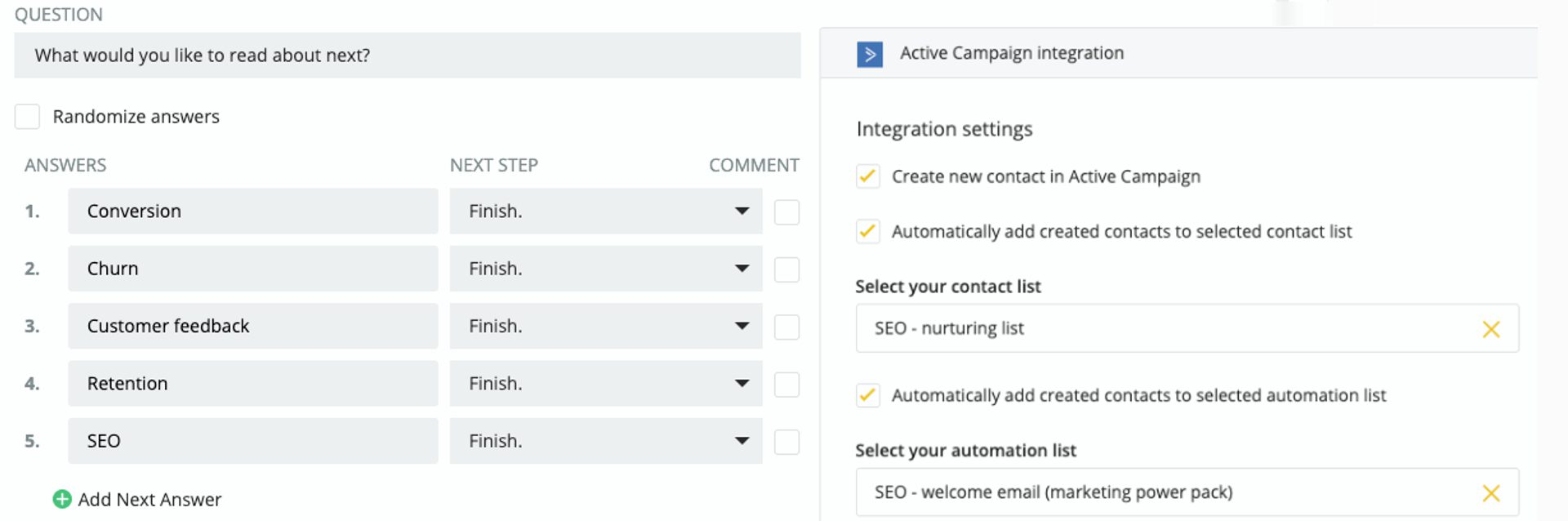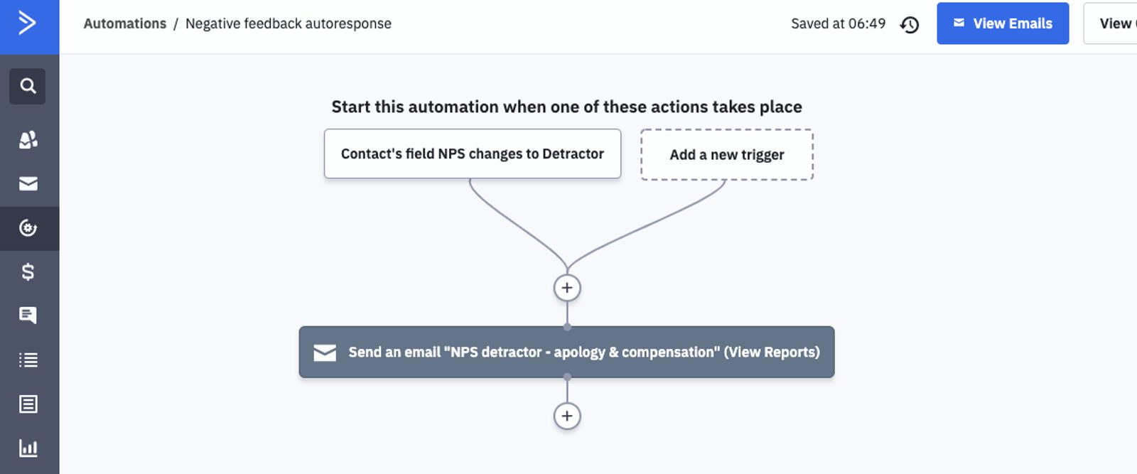 Sending out the NPS survey is just the beginning. After you send out the NPS survey, you should engage with both detractors and promoters. They can help you achieve different business objectives.Detractors can potentially damage your company’s reputation by leaving negative reviews, or they can simply stop using your services. You should try to do right by them and turn them into promoters. Here’s how.When you create a survey in Survicate, you can decide whether you’d like to send responses to ActiveCampaign. This means that if someone’s a detractor, passive, or promoter, you can have them tagged as such in ActiveCampaign.You can map survey responses into ActiveCampaign contact records as either tags or custom fields, then use those tags or fields to trigger marketing campaigns. You can also trigger internal notifications (through Slack, for example) to tell your teams to take action.