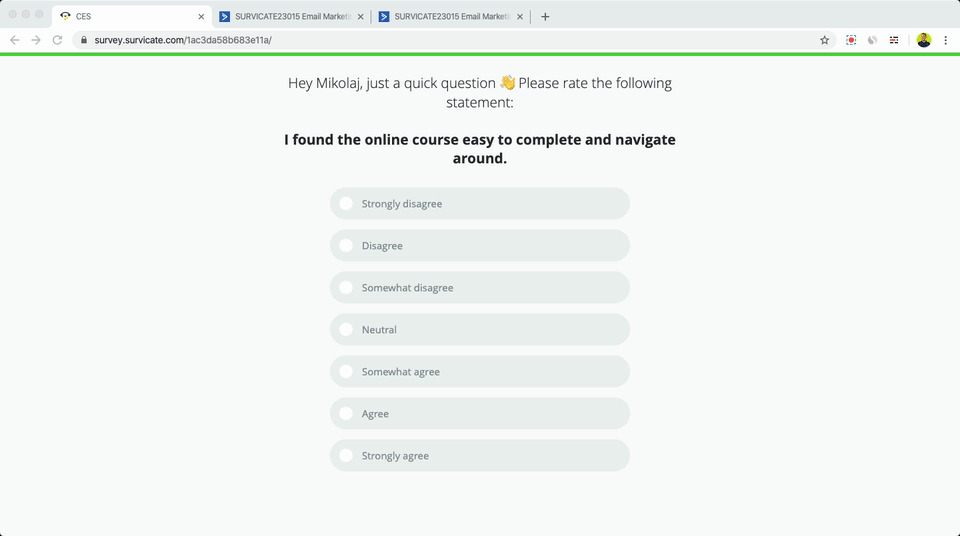 CES measures how easy your customers find it to interact with your company.Suppose you just released a brand new online course. It’s different from your previous courses when it comes to design and navigation. You could send the CES survey to your customers and get them to rate the following statement:“I found the course easy to complete and navigate around”. The available responses would be:- Strongly disagree