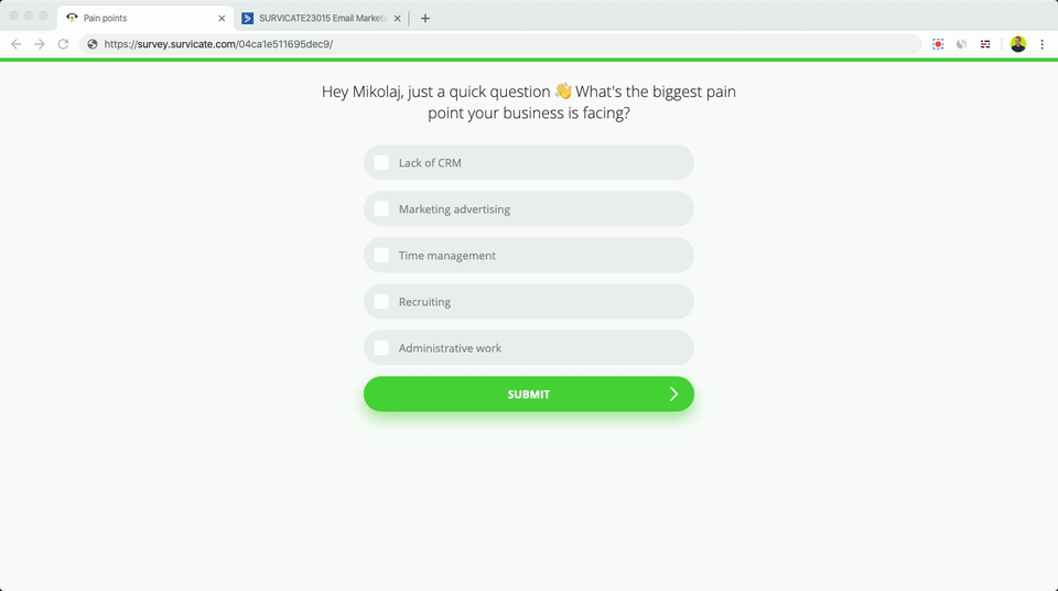 Discover your contacts’ pain points with a Survicate survey, then automatically send them persona-targeted content in ActiveCampaign.