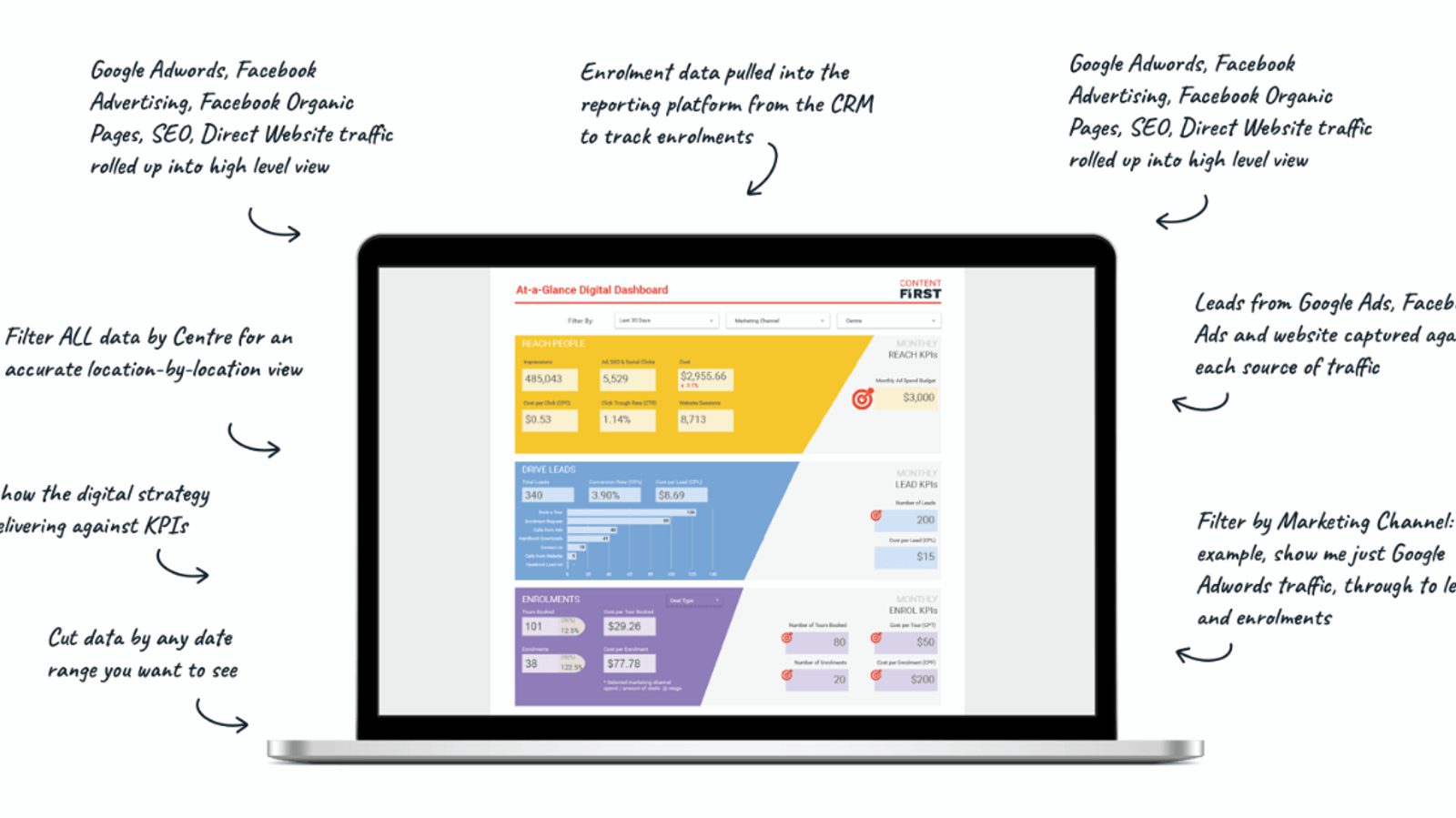 - Data filterable by marketing channel (i.e. only Adwords) to see the leads AND enrolments driven by the channel