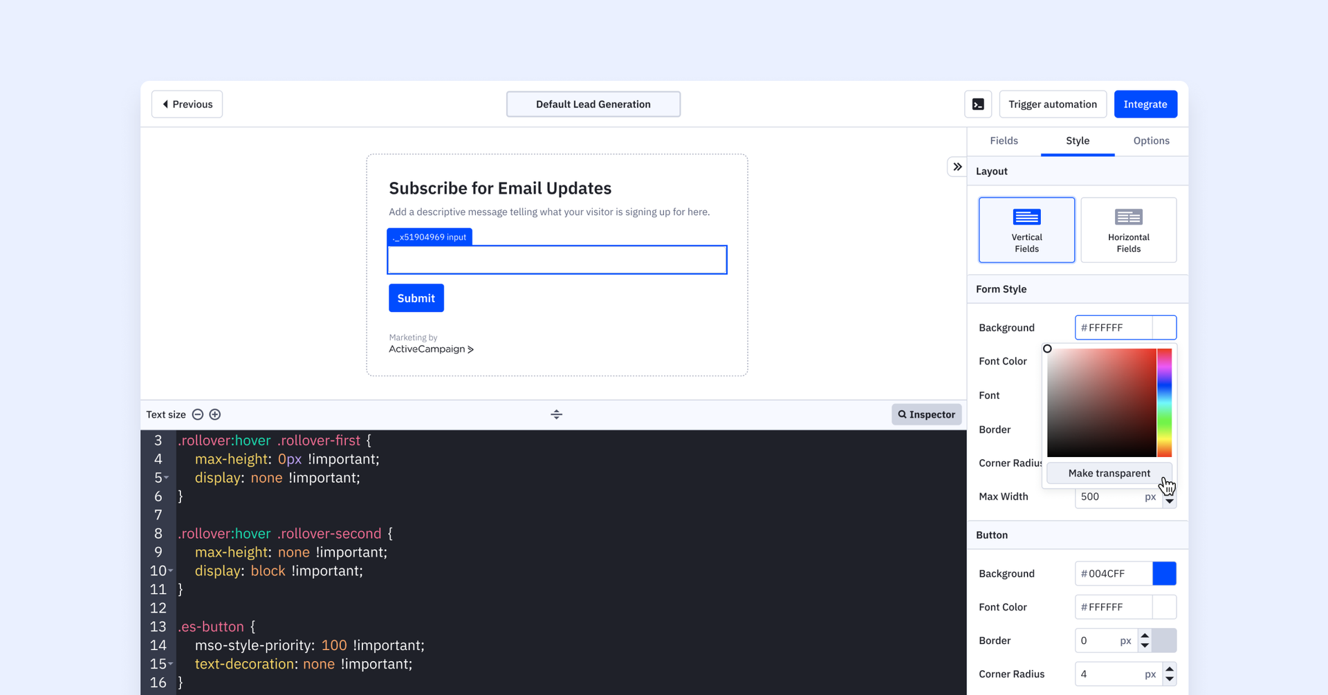 Create eye-catching forms with our forms builder or easily customize to your specific design style using CSS. Discover a broader range of customization options as we introduce a larger code panel for custom CSS and an enhanced inspector mode, empowering you to modify design and visual elements of your form.