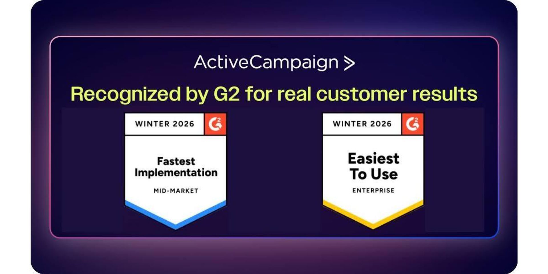 G2 has recognized ActiveCampaign with badges for Easiest to Use and Fastest Implementation.