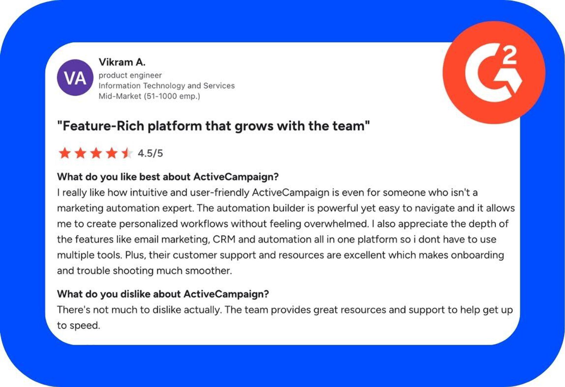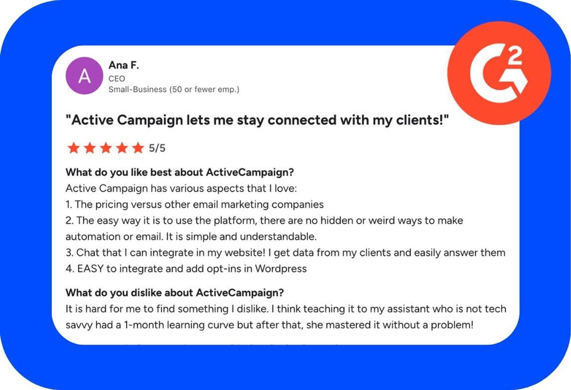 G2 review describing how ActiveCampaign is intuitive and easy to navigate, with excellent customer support and resources.
