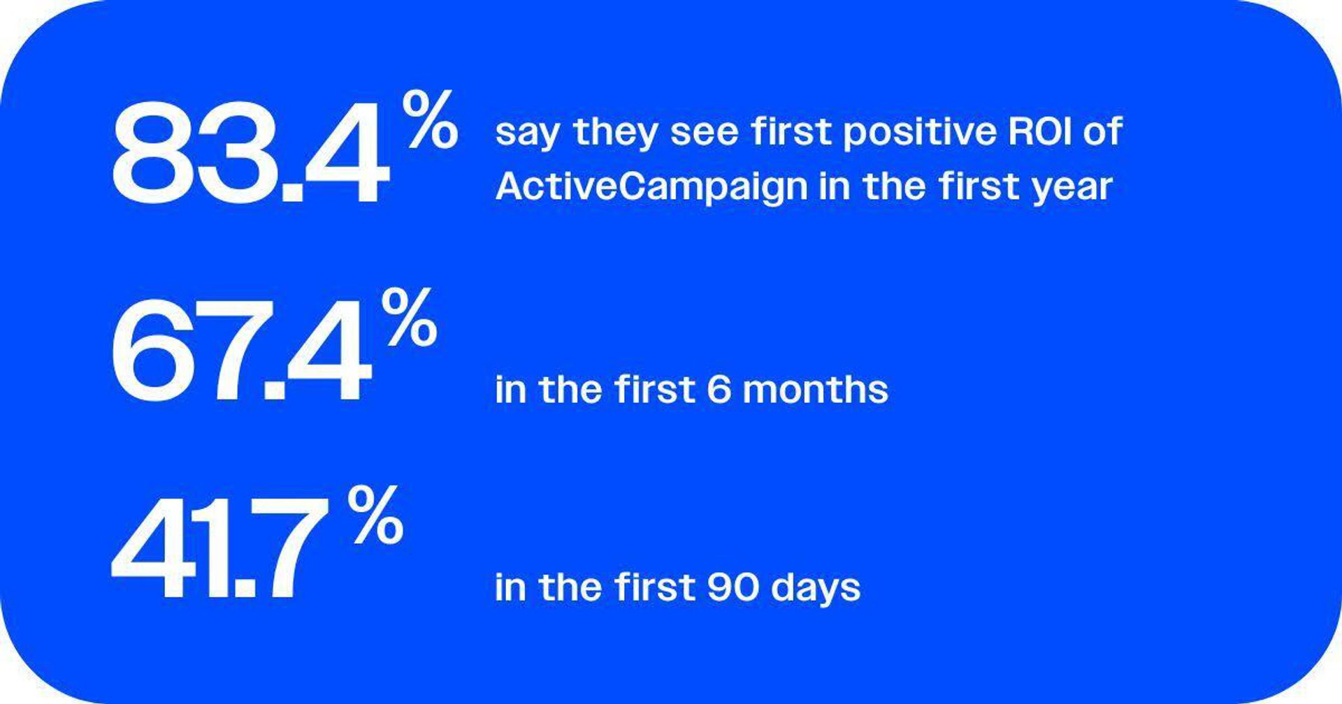 Statistics demonstrating ActiveCampaign’s time-to-value, where over two-thirds of users see positive ROI in the first 6 months on the platform.