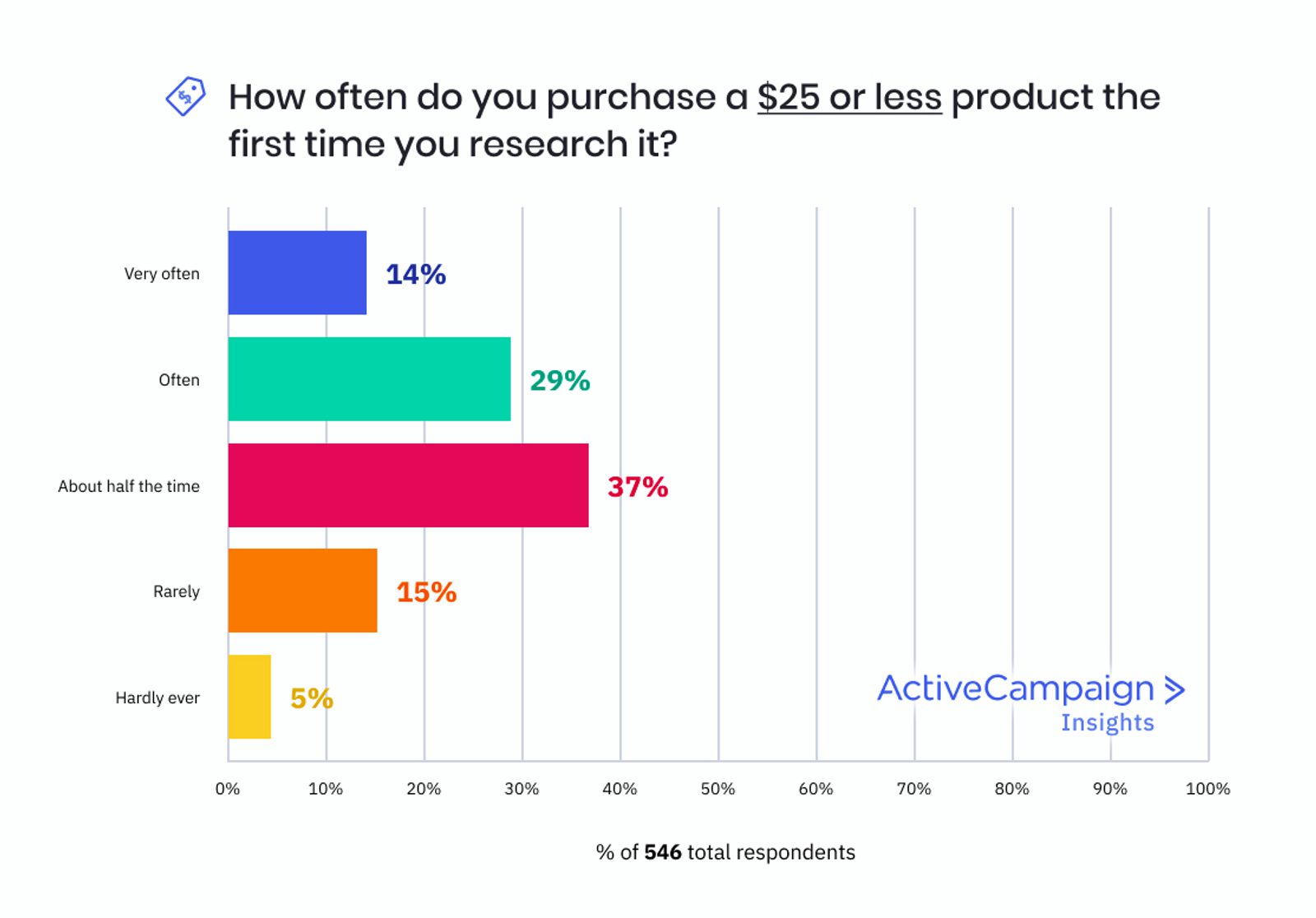43% of respondents “often” or “very” often purchase a <$25 product in their first research session.