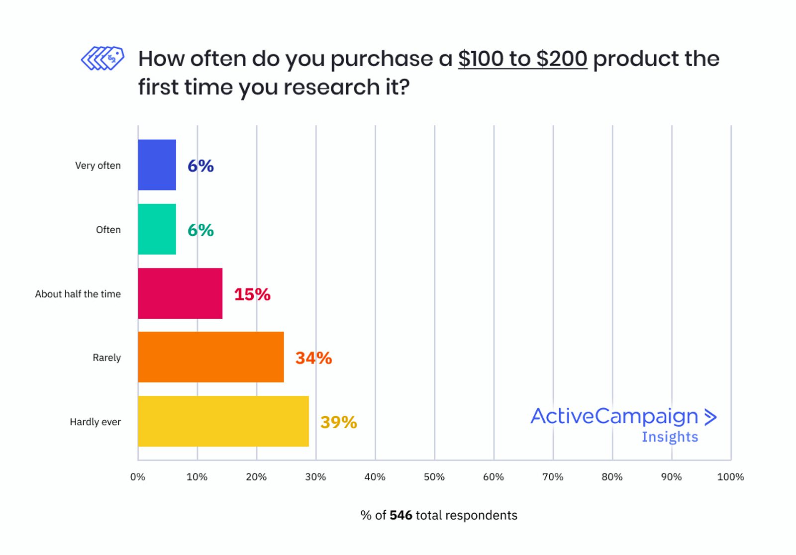73% of respondents “rarely” or “hardly ever” purchase a $100–$200 product in their first research session.