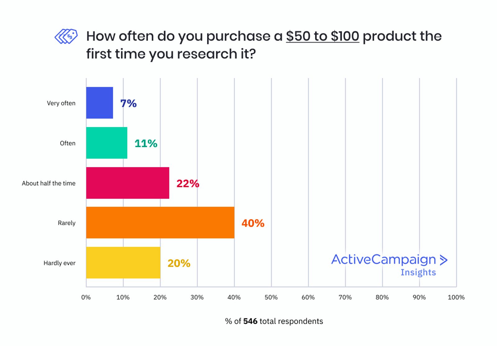 60% of respondents “rarely” or “hardly ever” purchase a $50–$100 product in their first research session.
