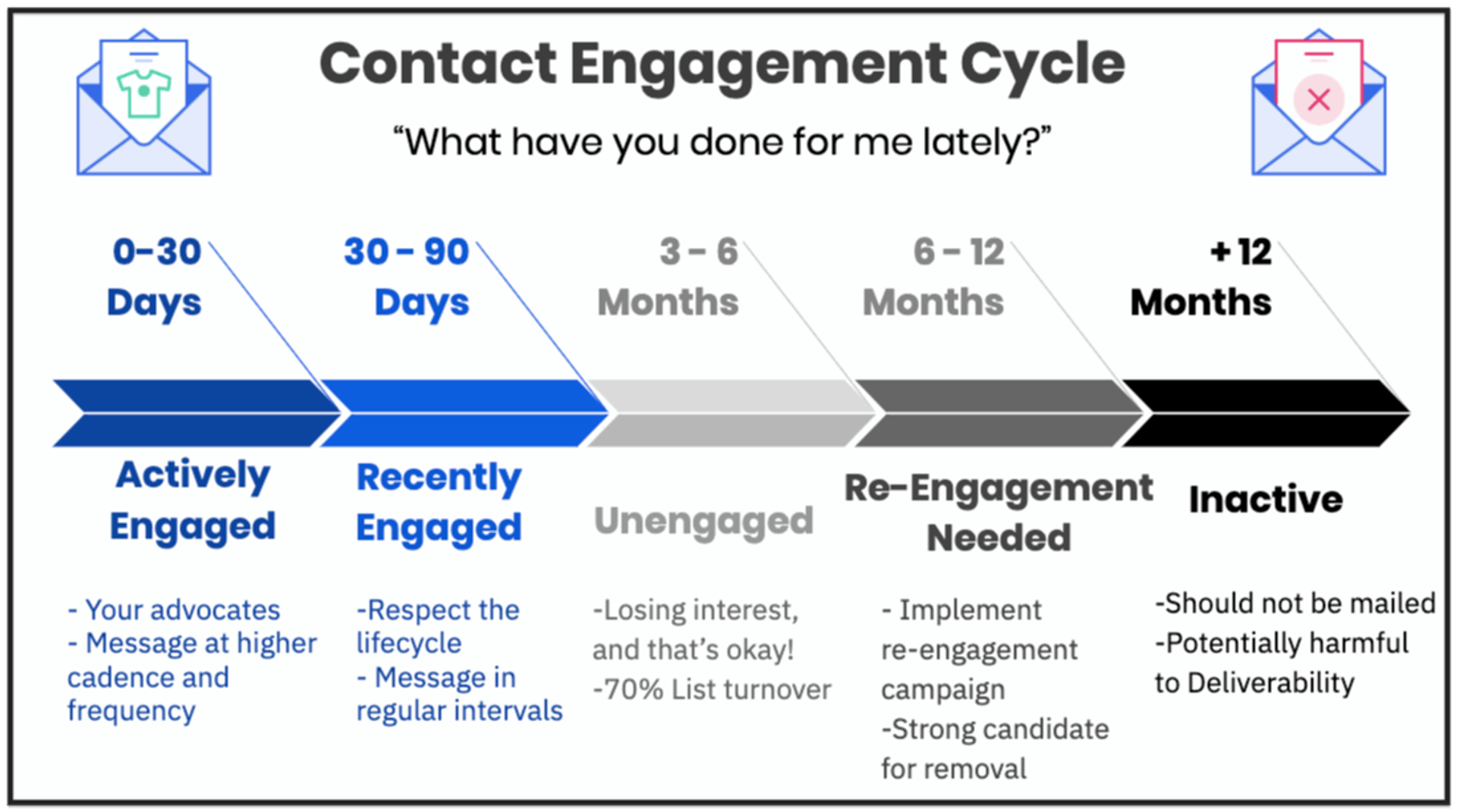- Inactive: Remove these contacts from your email list. Continued sending to them is dangerous for your deliverability and can be detrimental to your overall deliverability.