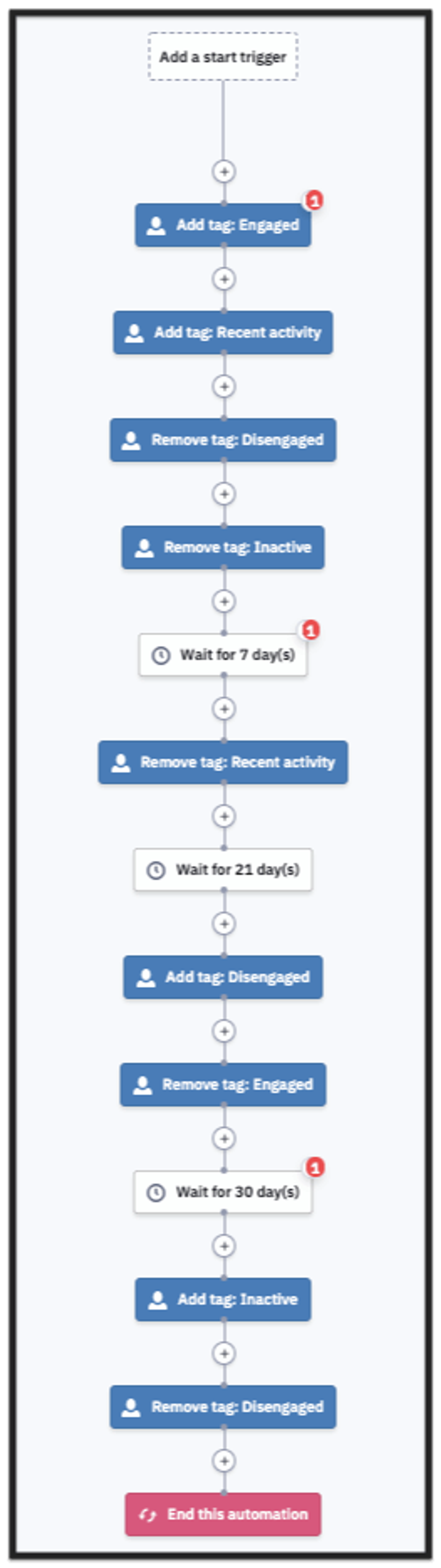 This ActiveCampaign automation tags your email contacts in real time as they engage with your content. You can import this automation into your ActiveCampaign account for free here.