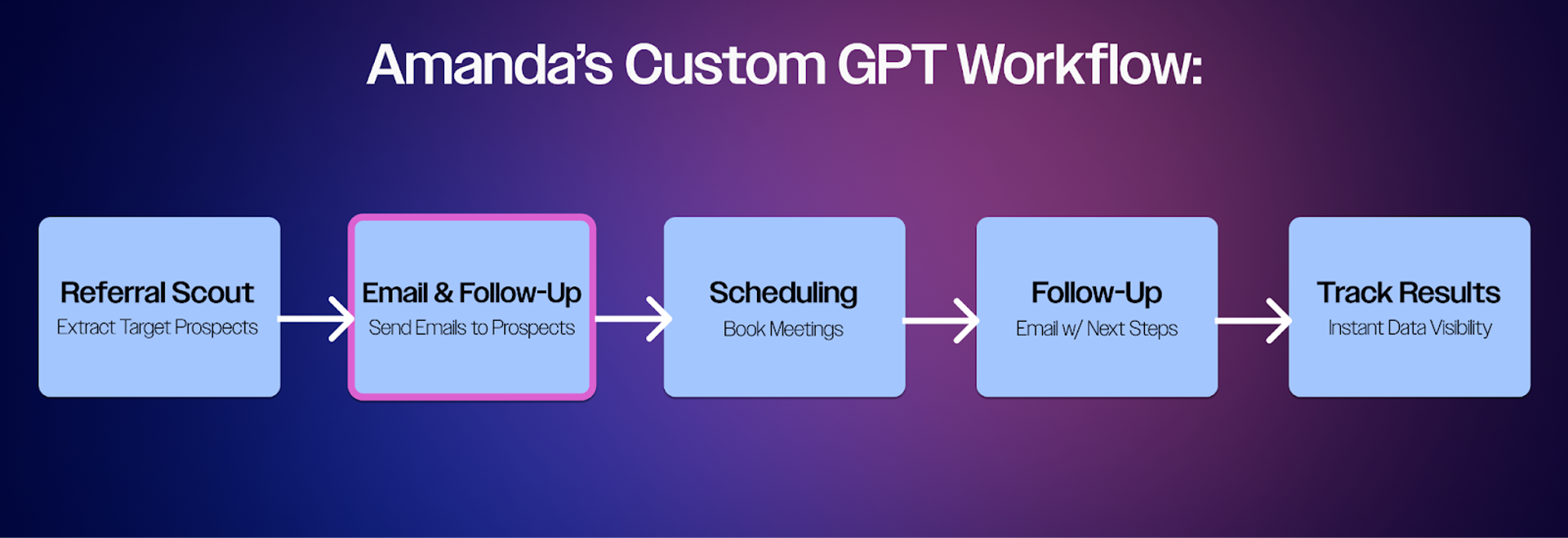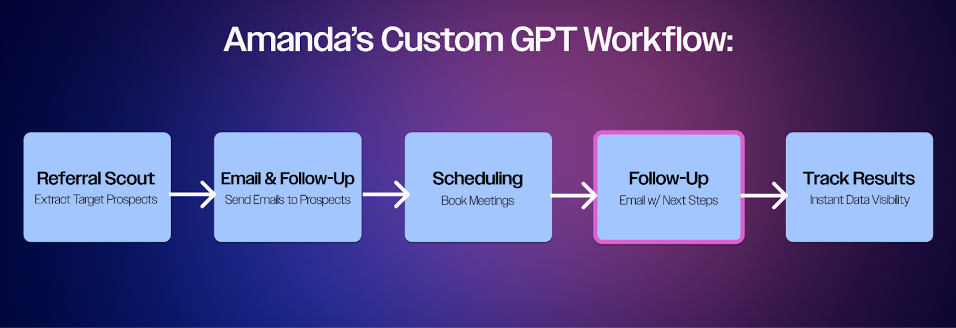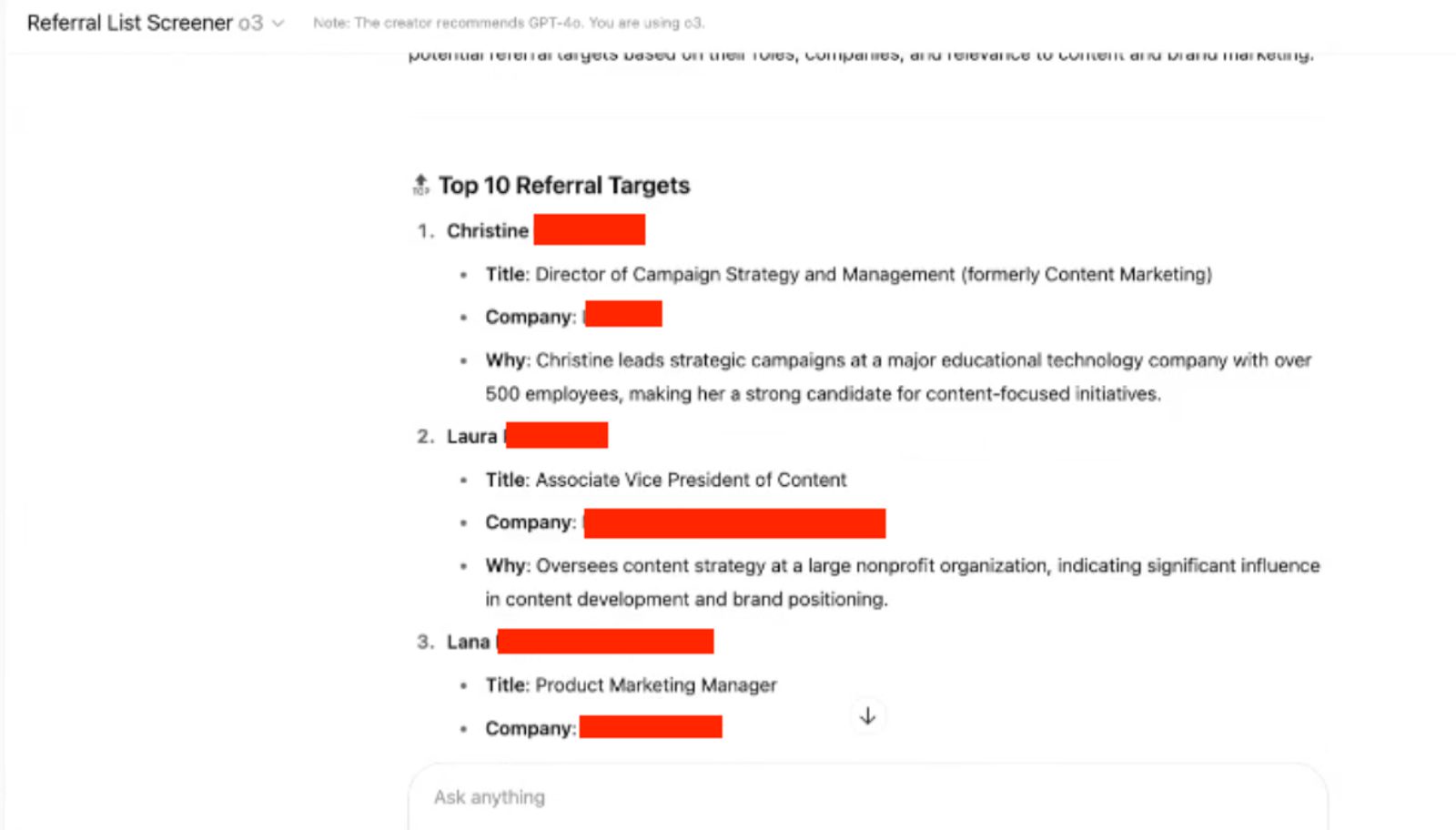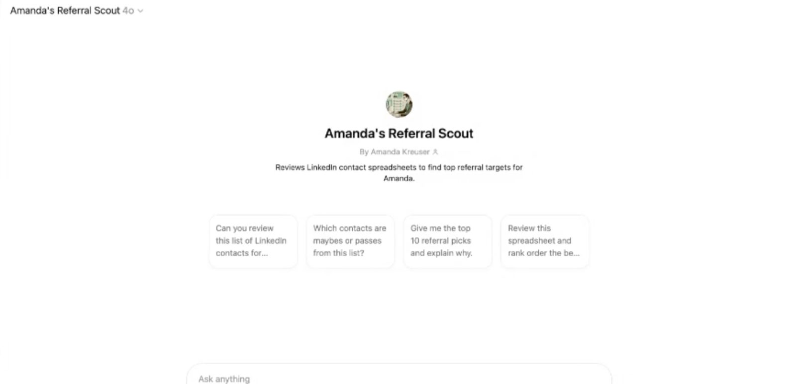 She created a custom GPT she named “Referral Scout,” which she built based on her ICP. The referral scout scans the downloaded list to suggest people worth connecting with, and who could make introductions. She then has a curated list she can bring back to her original contact and say, “this is who I’d like to meet.”
