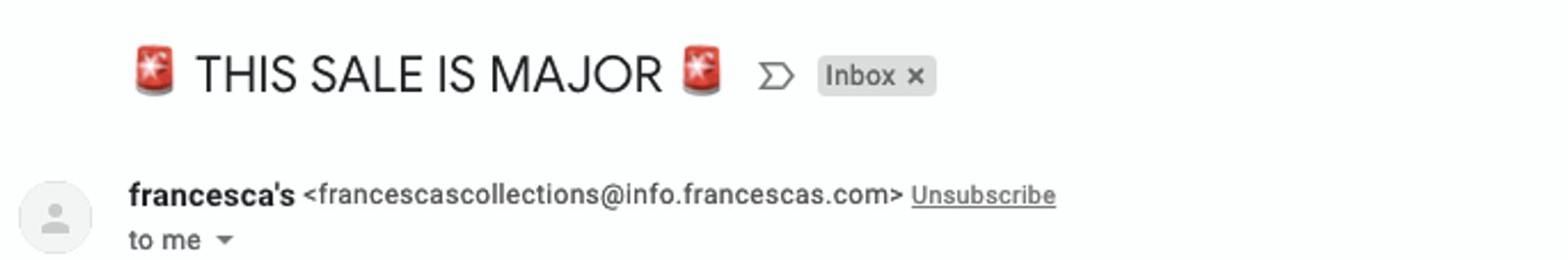 How do ambulances get your attention? Sirens and flashing lights. Thank goodness sirens aren’t email friendly, but Francesca’s found a way to incorporate a visually stimulating emoji in the subject line to get attention faster.