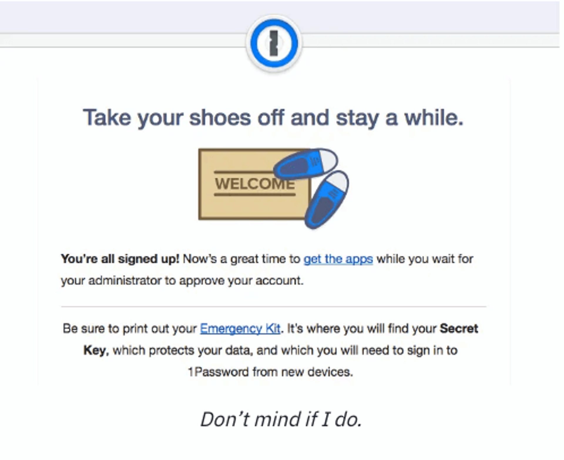 84% of B2C welcome emails make it into the intended recipient’s inboxes globally and have an impressive 23% read rate. 1Password, a password manager, digital vault, form filler, and secure digital wallet, makes the most of this with its engaging welcome messaging.