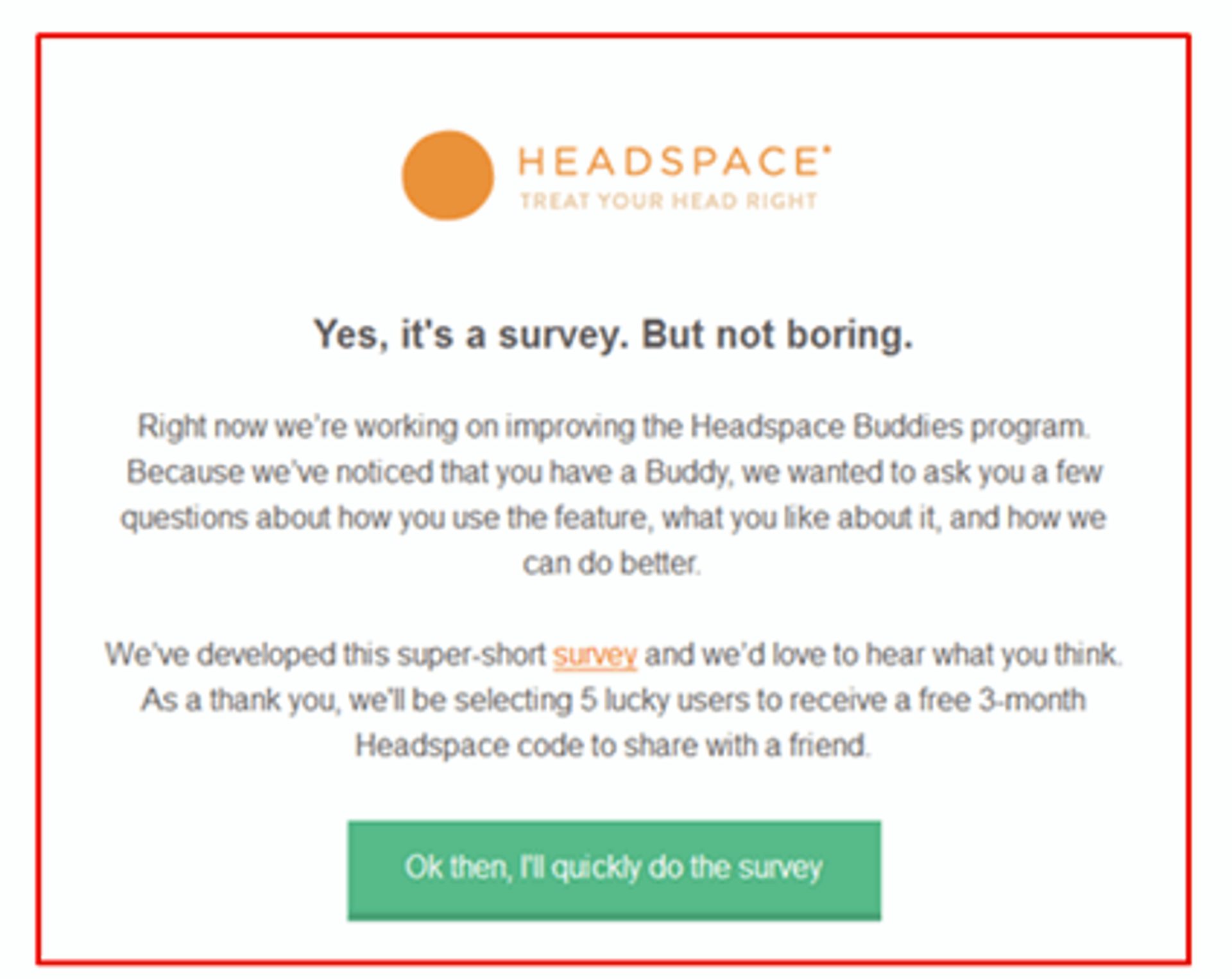 Headspace, an online healthcare company, specializing in meditation, wanted to know more than how their users felt about their Buddy feature. So they sent this example of a great email survey.