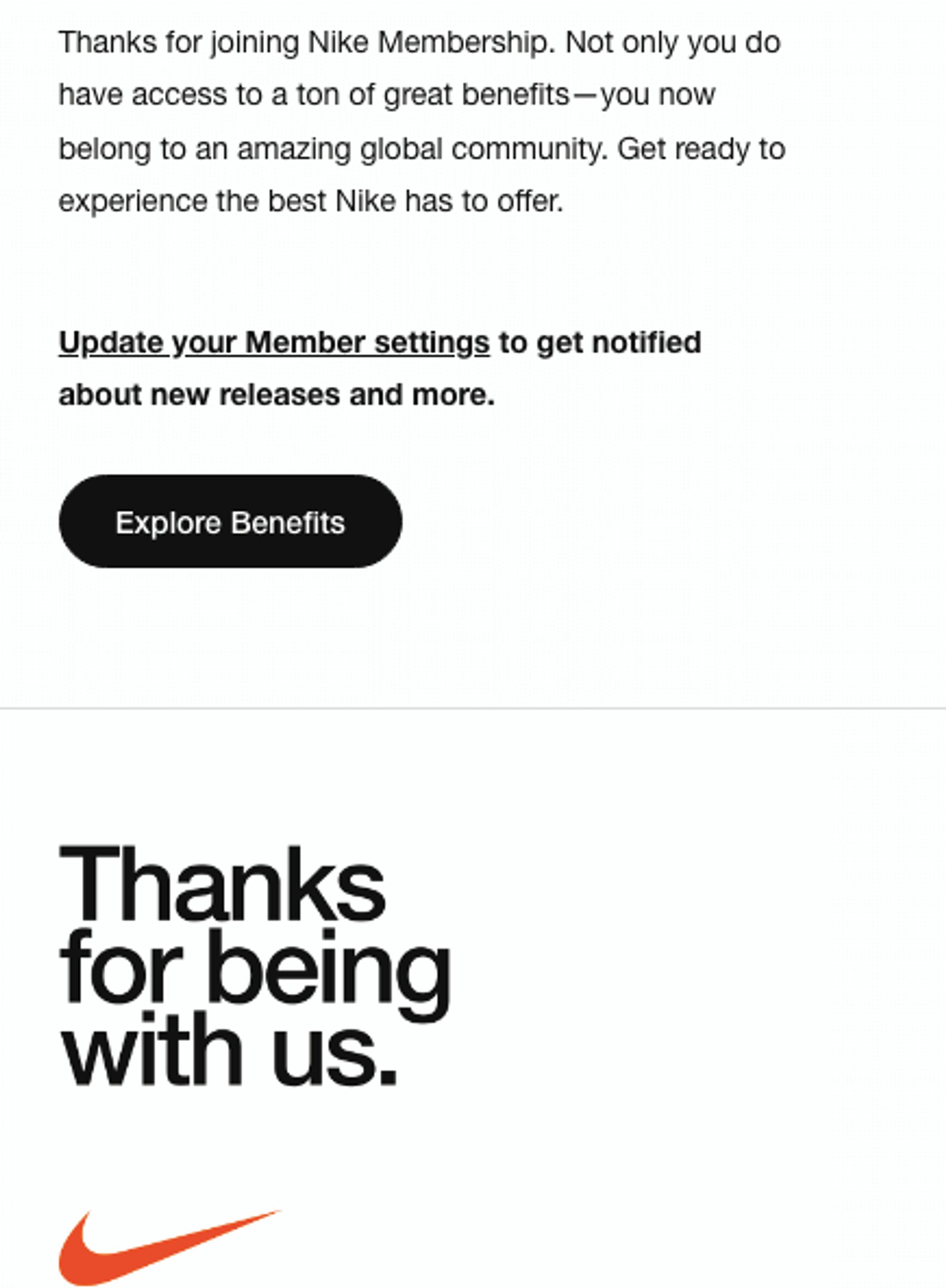 Nike knows that simple is best, and their marketing email keeps things that way. If you sign up to join them, you’ll receive an email that immediately makes you feel included and welcomed into the company, like a valued team member.