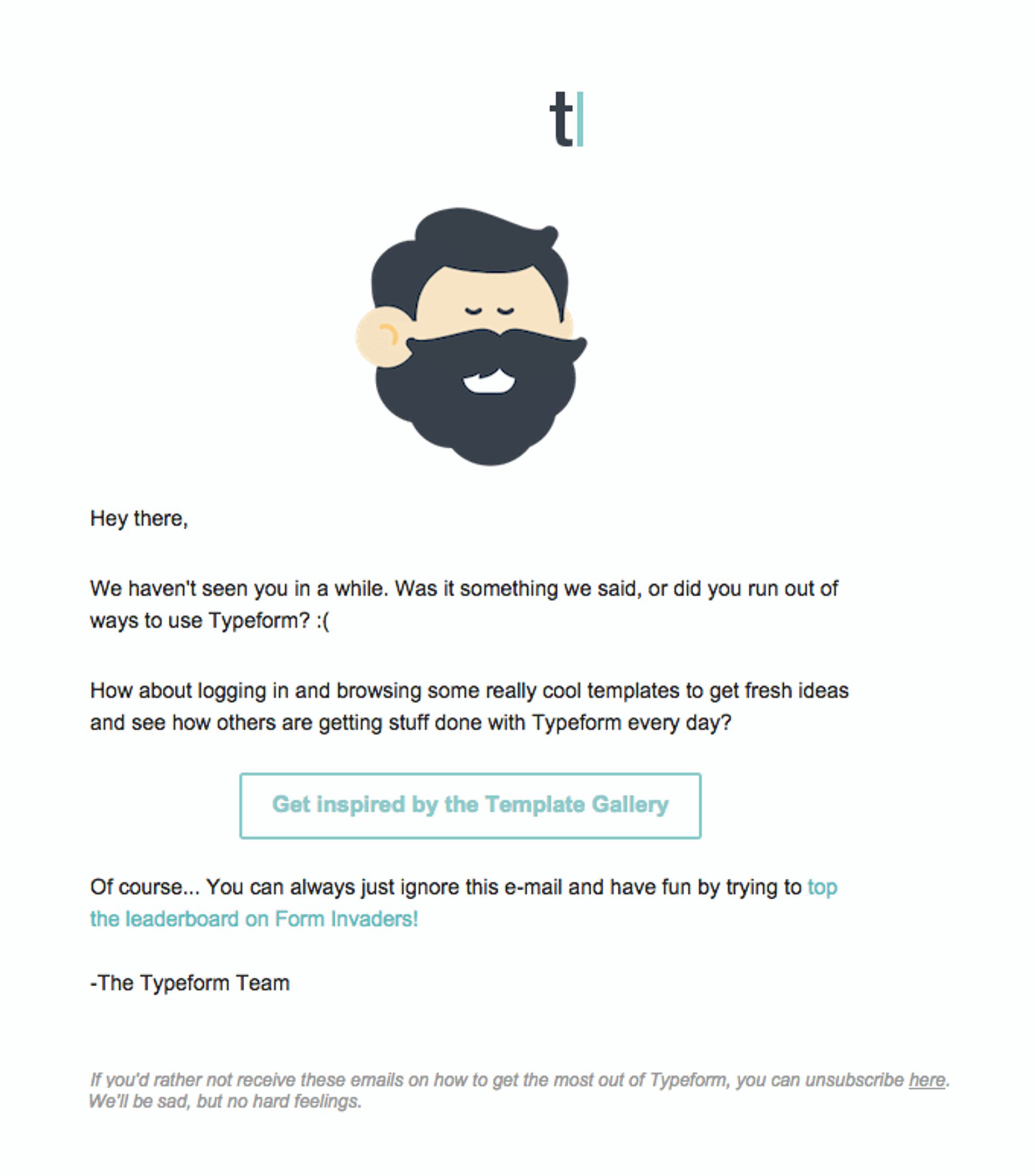 Typeform is an online software company based in Barcelona specializing in online form building and surveys. Typeform’s re-engagement email is 1 they send customers who have stopped using their product.