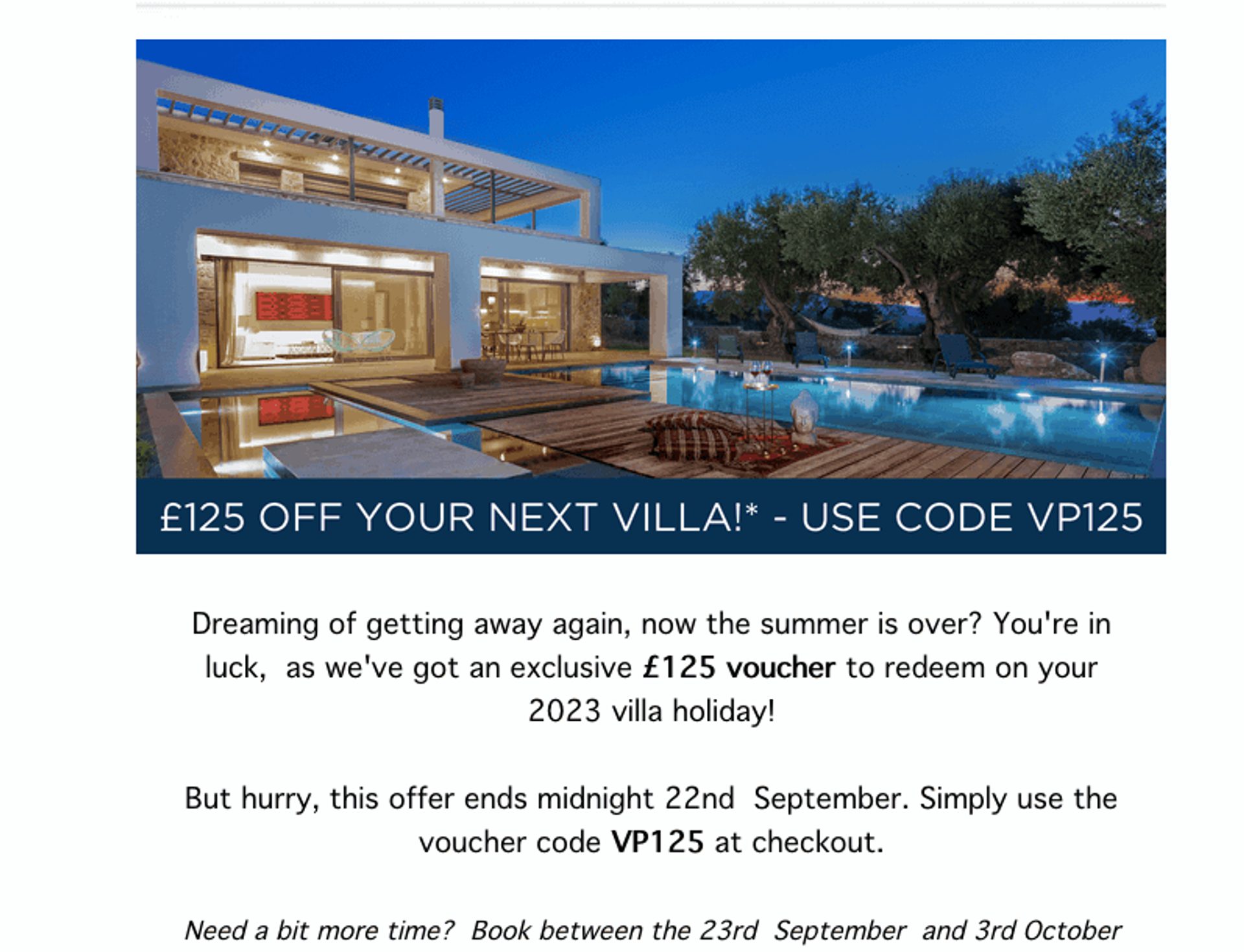 Their email not only gives you a great incentive to book with them by offering a chunk of money off your next booking; it also creates time pressure by giving an expiry date for when the money off voucher runs out.