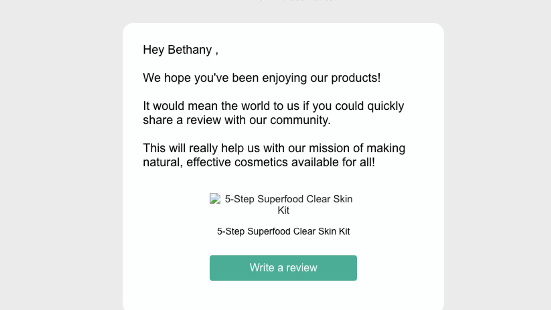 This email type drops into your inbox after you purchase 1 or more of their products. Rather than offering rewards, they ask the reader to write them a review, but they do so in such a genuine way that it’s pretty hard not to want to comply.