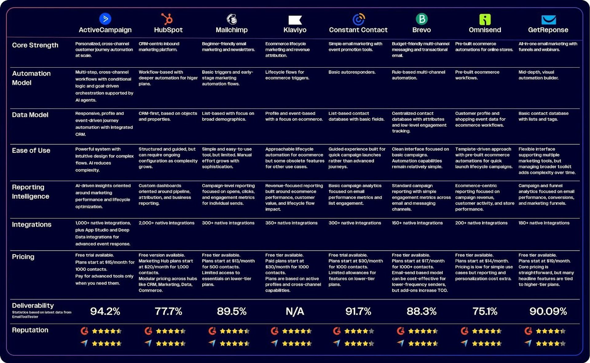 | Klaviyo | Klaviyo is built for ecommerce creation, with catalog-driven product blocks, manual campaign setup, light AI assistance, and standard preview and testing tools. | Klaviyo combines strong managed delivery with event-triggered ecommerce automation, making it especially effective for online shopping flows. | Klaviyo’s analytics are a strength, with flow-level revenue attribution and ecommerce-specific performance reporting. | Klaviyo is strong at optimizing ecommerce workflows through behavioral triggers, A/B testing, and predictive models, though it is narrower than broader automation platforms. |