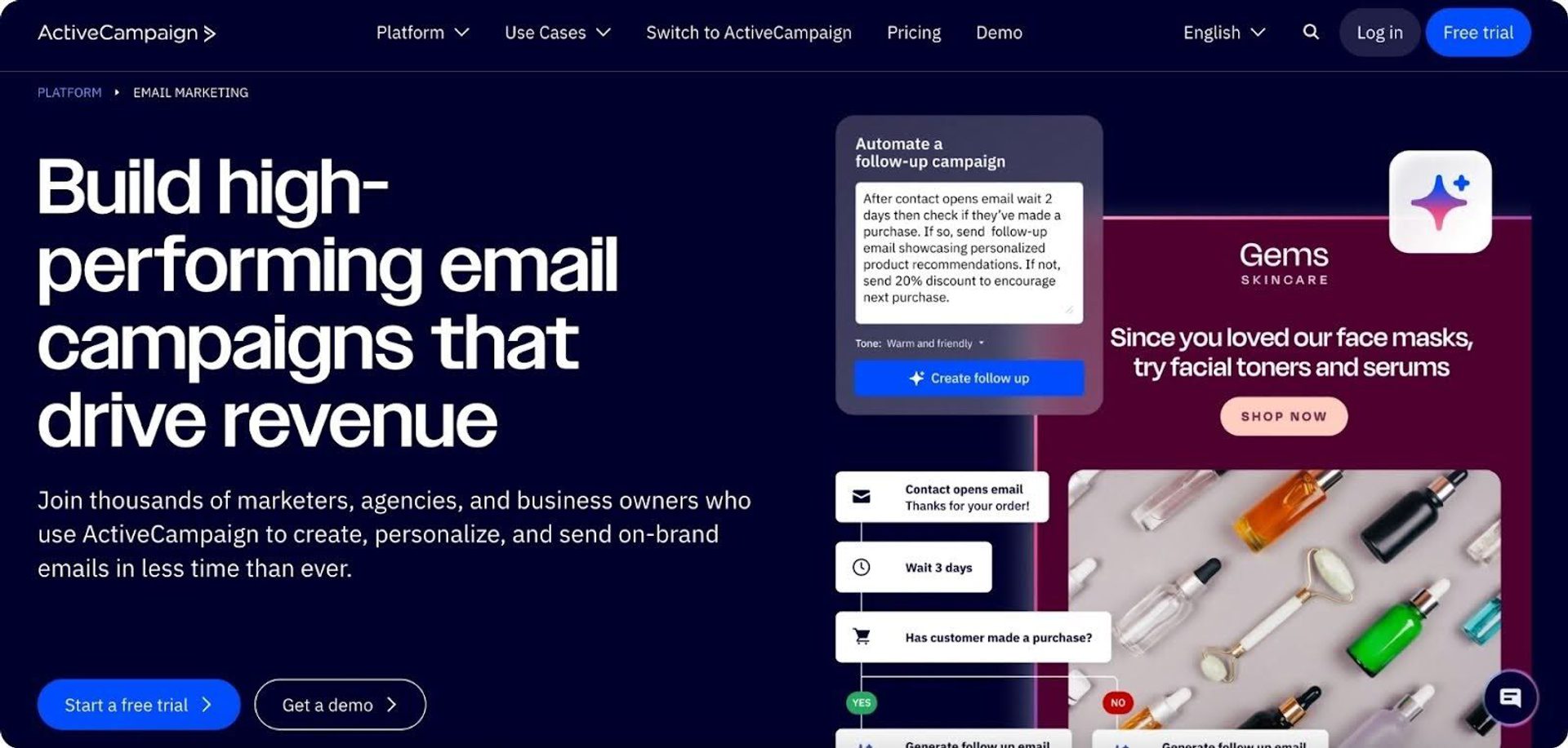 ActiveCampaign is the strongest email marketing software choice for growing businesses. Its AI-powered automation, built-in CRM, and cross-channel orchestration help small teams scale campaigns without adding headcount. The modular add-on structure means you only pay for capabilities as you need them.
