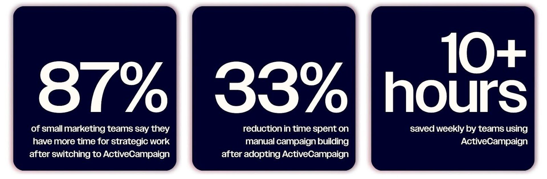 Marketing teams using ActiveCampaign save an average of 10 hours weekly across tasks like campaign building, content creation, and lead follow-up.