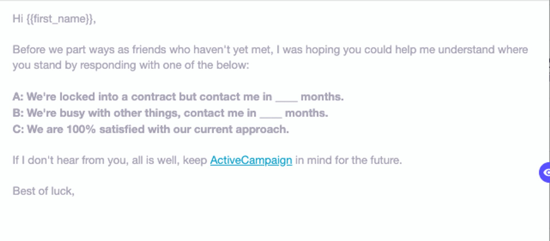 It’s not necessarily goodbye forever, just for now. This email leaves the door open for future communication AND helps you learn more about your leads.