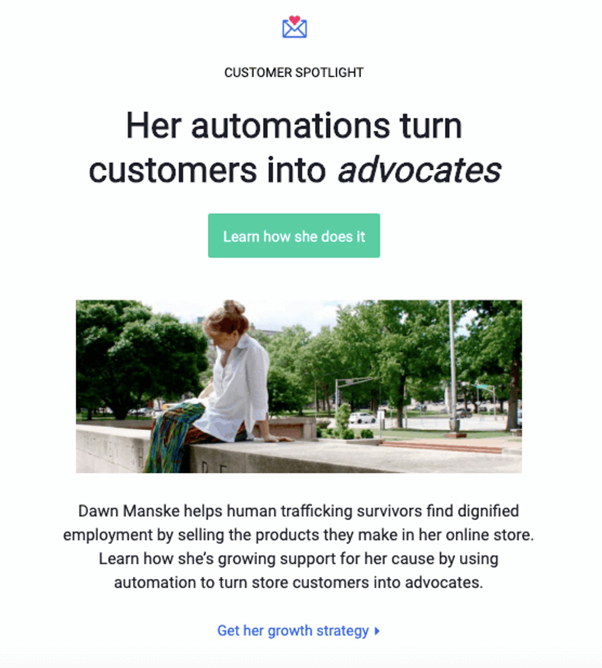 One great way to help leads get to know your business better is to show them how others have enjoyed working with you. Our customer spotlights are one type of marketing email we send. In spotlights, we feature the stories of people who useActiveCampaign.