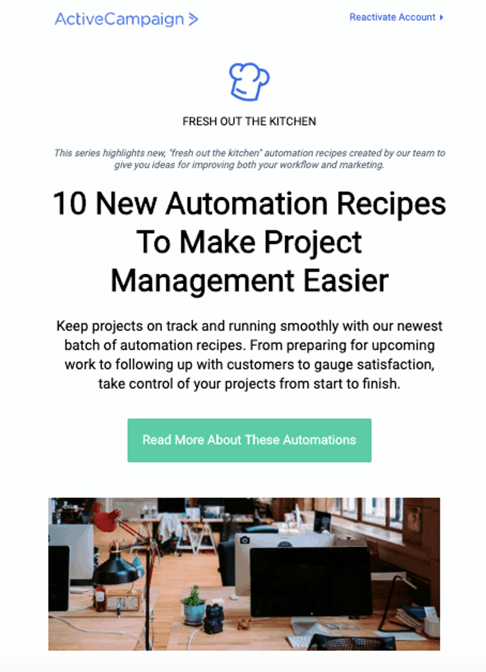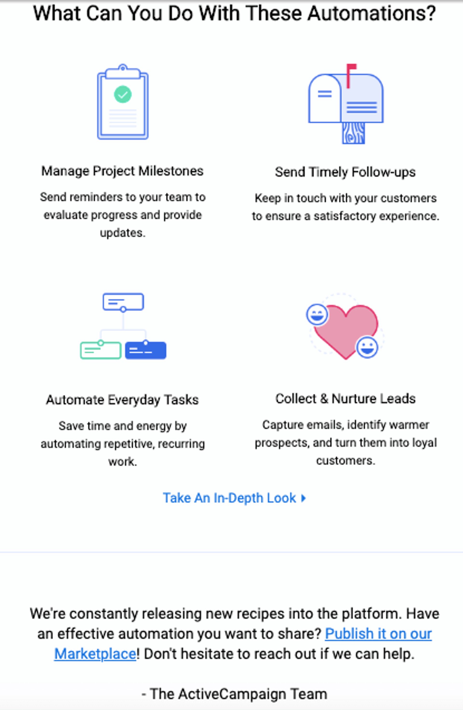 Our automated email marketing is intuitive and easy to use, but it gets even easier after we send an automation recipe email.What if you know you want automation, but aren’t sure what automation you want?These marketing emails contain ready-made automation recipes that are easy to set up.