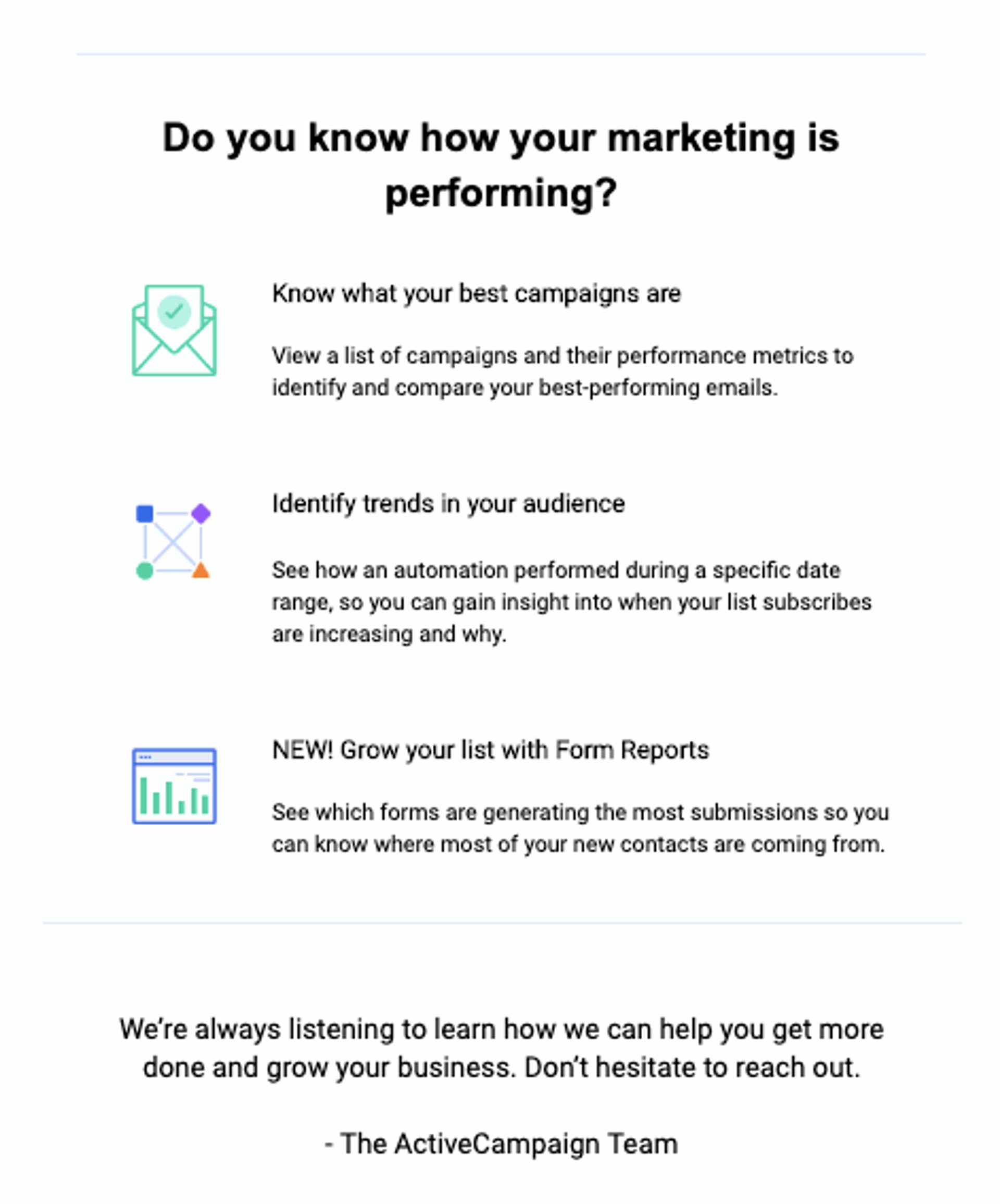 Say someone visits your website and signs up for your list, but hasn’t made a purchase. A product update email can show your leads exactly what they get when they become a customer.