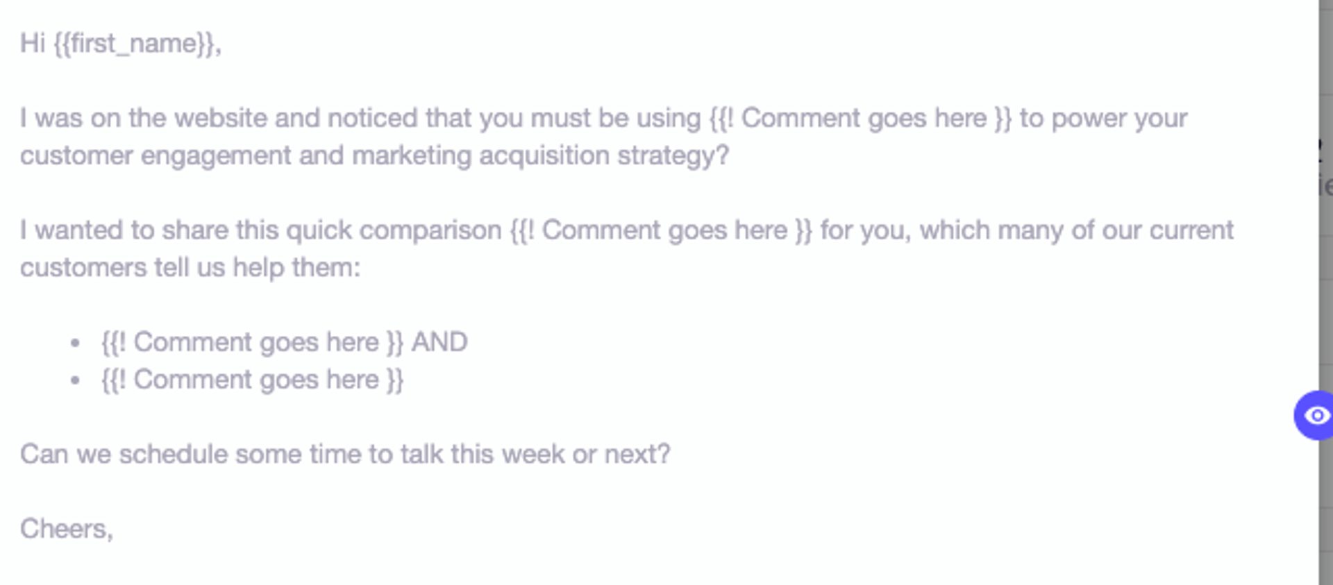 This cold email template leaves a place for the sender to show that they’ve done some research and are working to build a relationship. Also, check out the rest of our email templates.