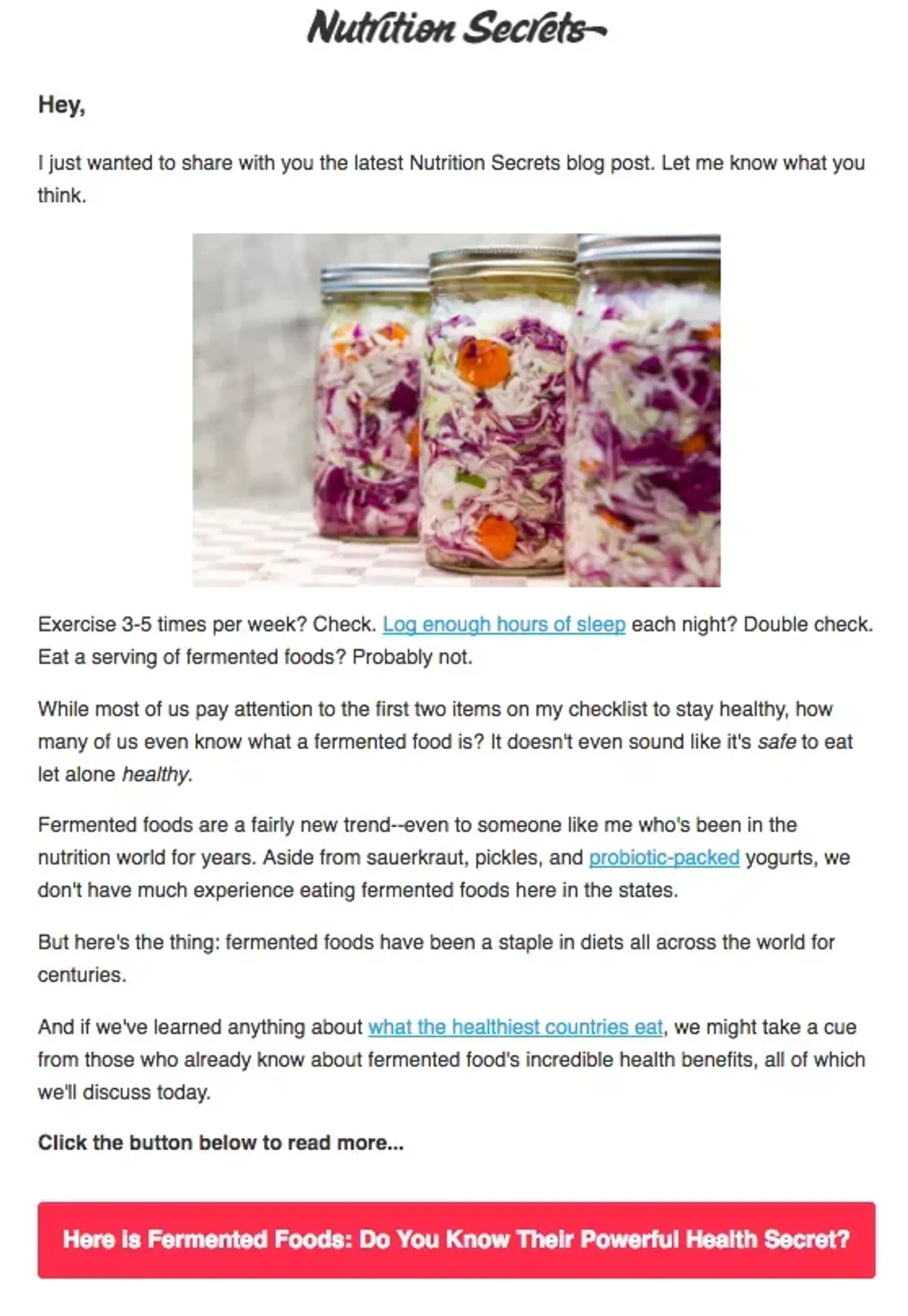 A marketing email is designed to show leads the benefits they could unlock by becoming a customer. They are not meant to be pushy, sales-focused emails, because most contacts getting them are not ready to buy from you yet.More often than not, people who get marketing emails aren’t looking to buy from you right now. That means they need helpful information – you can bring people closer to the point of sale by giving them free information that solves their problems. Check out this marketing email example from Nutrition Secrets.