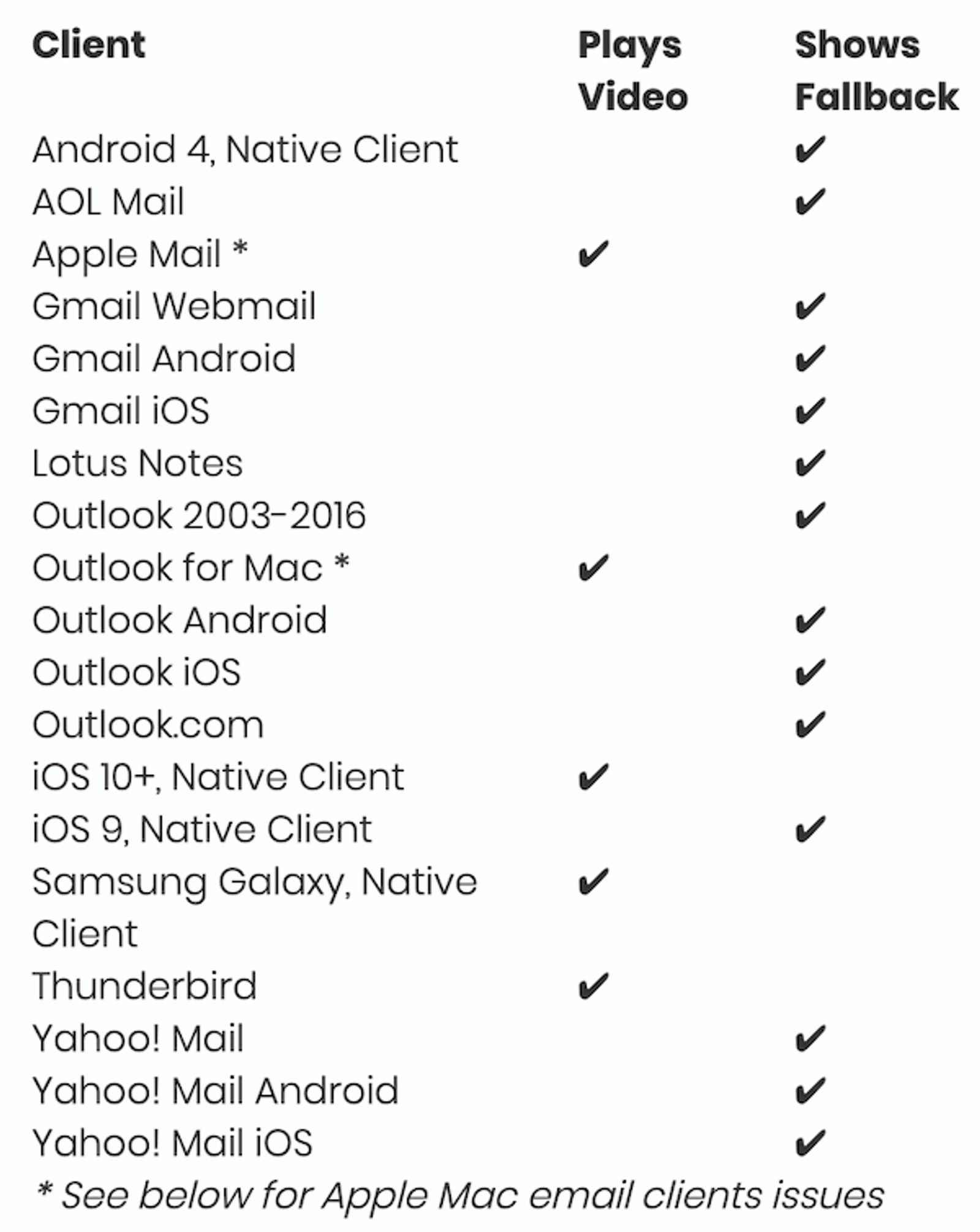 This chart from Email on Acid shows which email clients play embedded videos and which show a fallback video thumbnail image. Most email clients show the fallback, making all of your HTML5 work for naught.