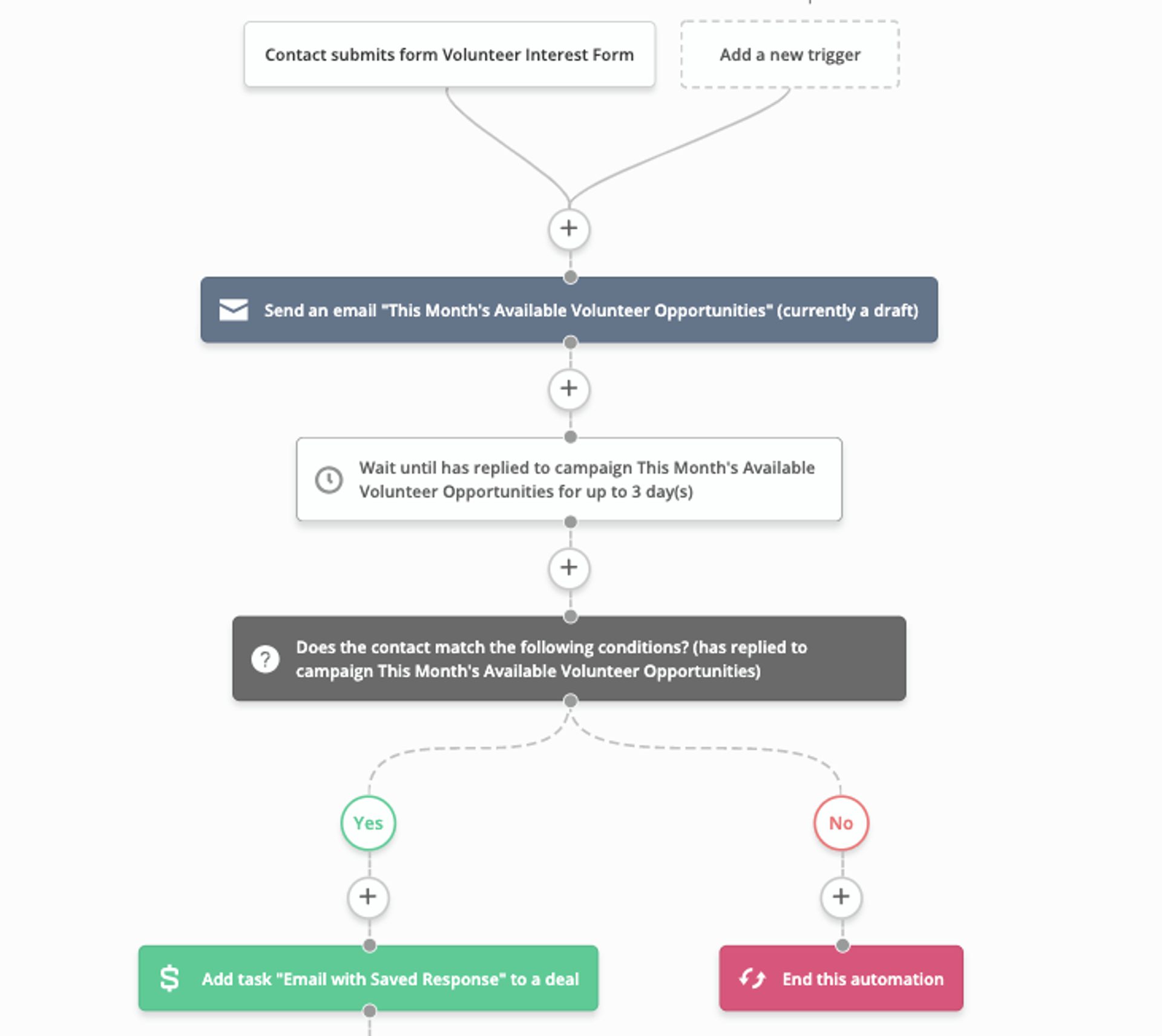 - ActiveCampaign automatically emails the potential volunteer with available options