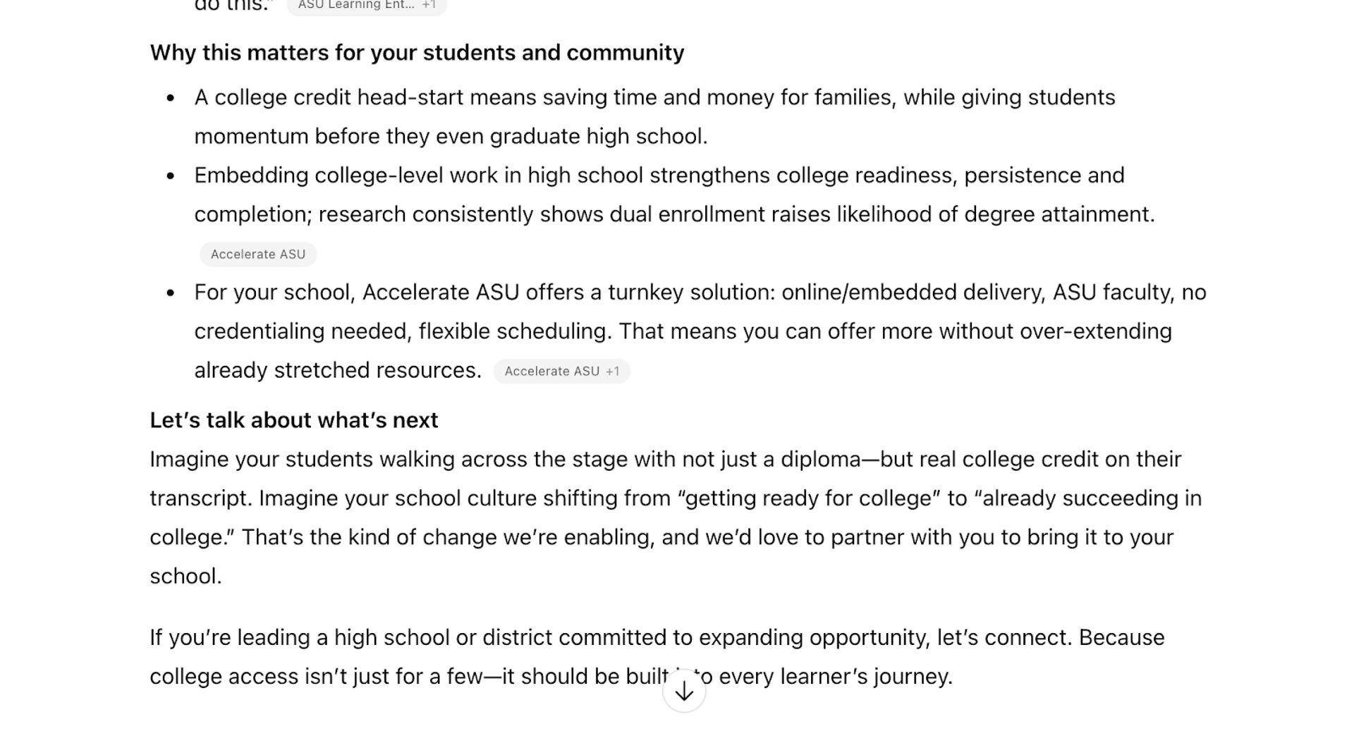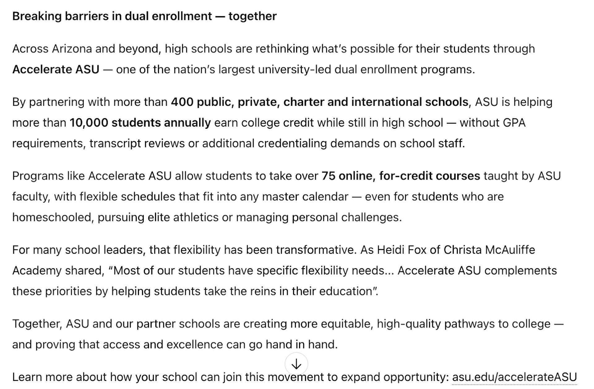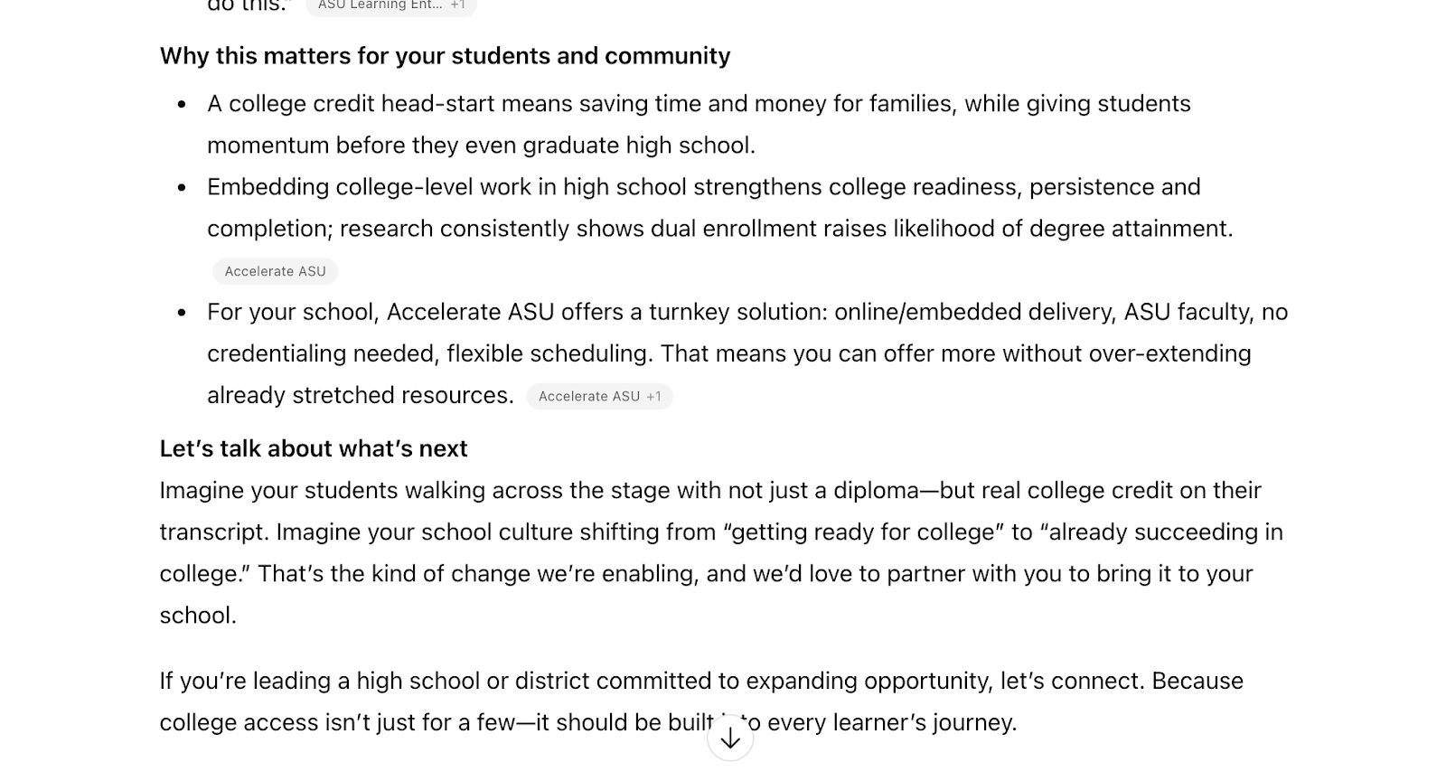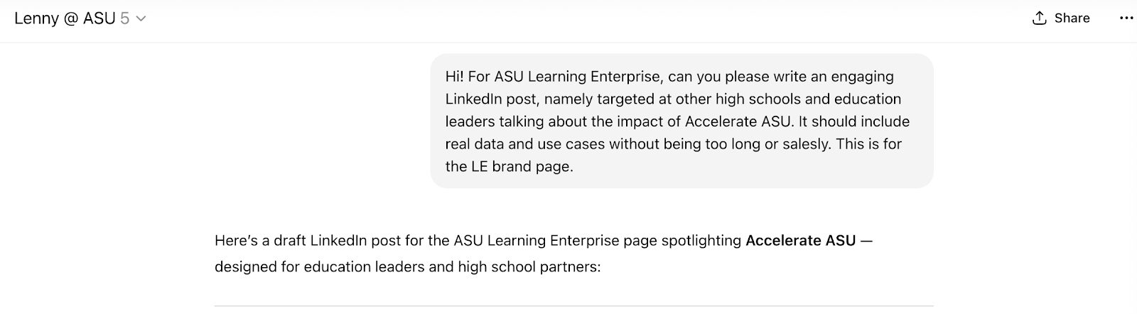 When Becker demonstrates Lenny in action, the difference between generic AI and a custom-trained bot becomes immediately clear. She prompts both standard ChatGPT and then asks Lenny to write a LinkedIn post about Accelerate ASU, the university's dual enrollment program that allows high school students to earn college credit.
