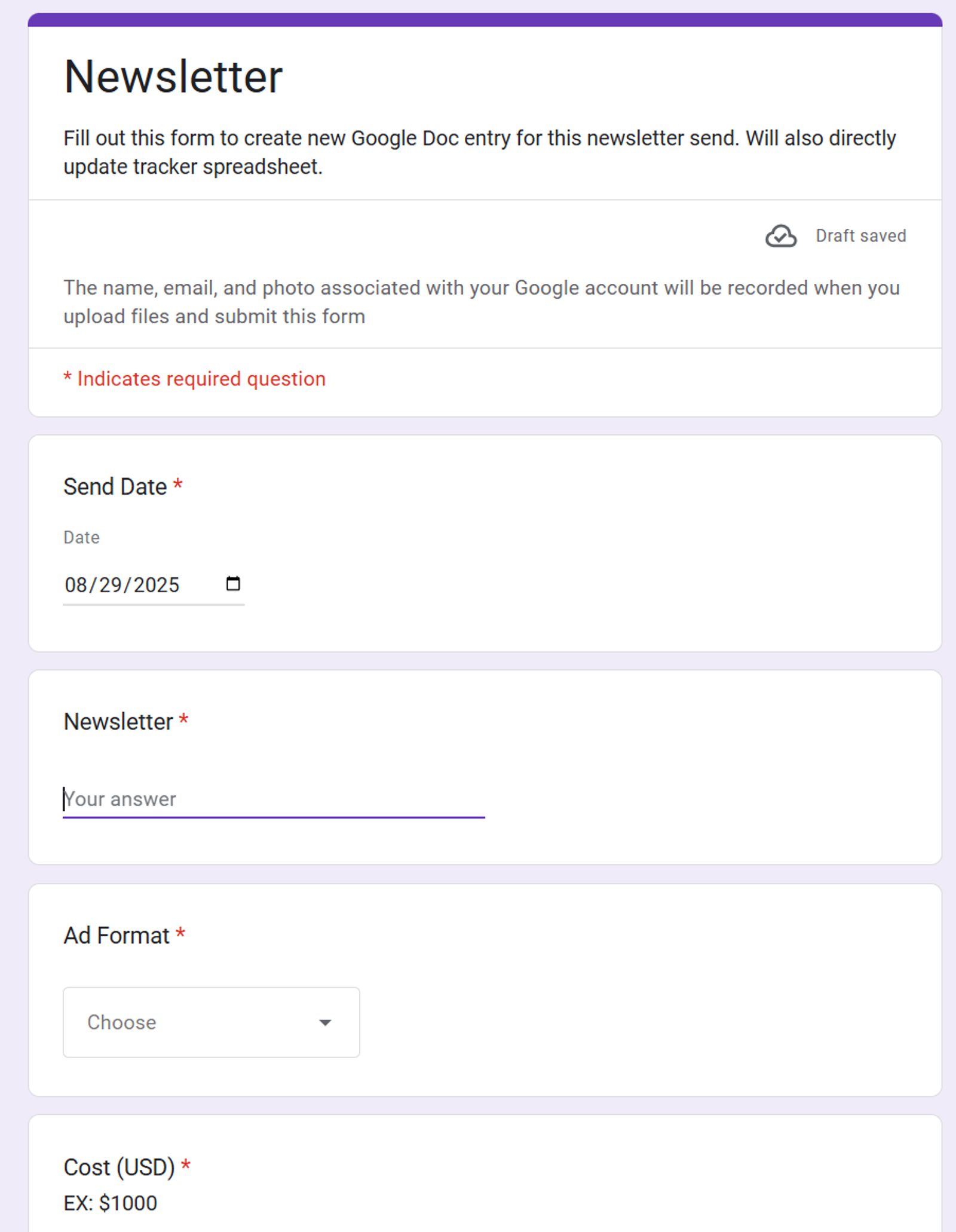Goodwillie built his system using Google Gemini. Each time a new newsletter ad runs, the Stack team fills out a simple Google Form with key details: