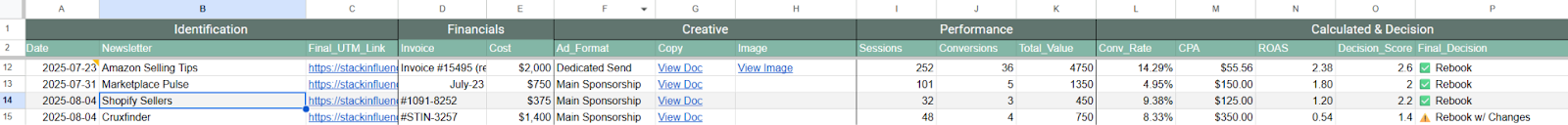 Using another Gemini-generated script, Goodwillie connected Google Analytics directly to the tracking sheet. Each time a newsletter runs, the script automatically pulls in UTM data the following day (things like impressions, clicks and a newer “Google value” field). This gives the team an immediate snapshot of how the ad performed without having to manually log into multiple platforms.