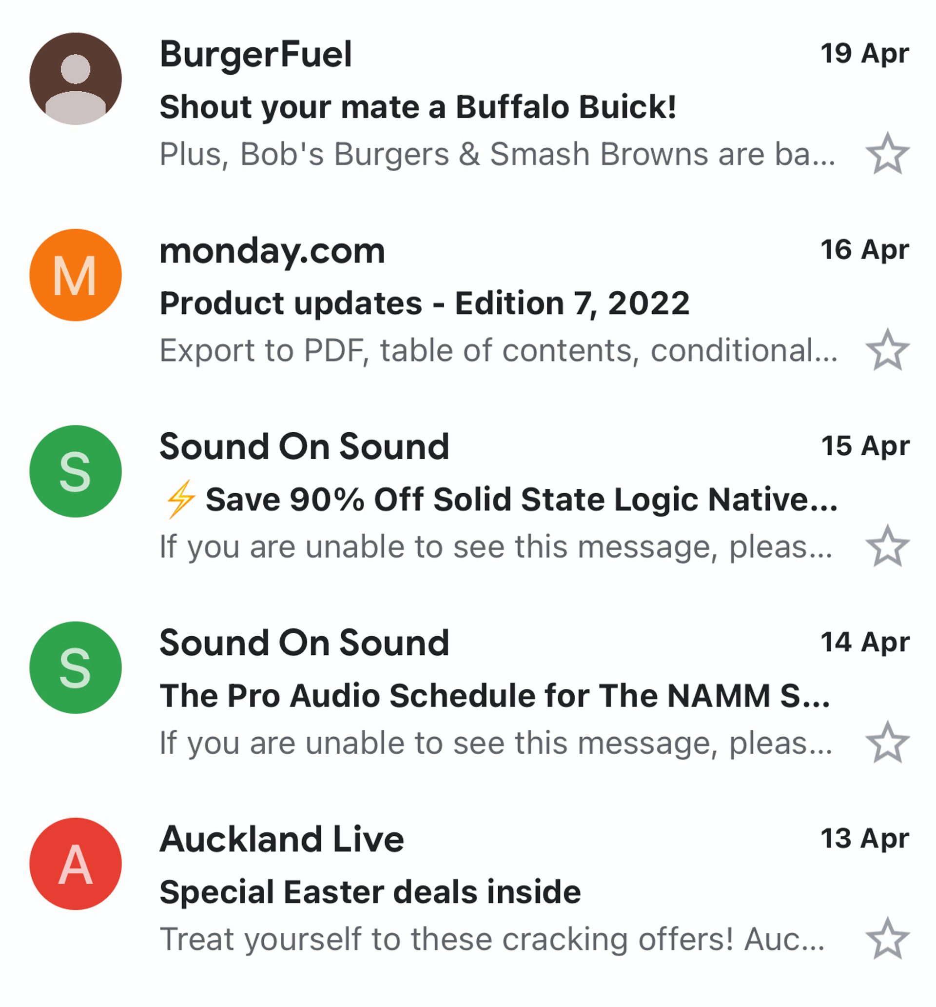 Notice how Sound On Sound has failed to take advantage of this opportunity in the above example, whereas BurgerFuel and Auckland Live provide more context and build the case for recipients to read further.