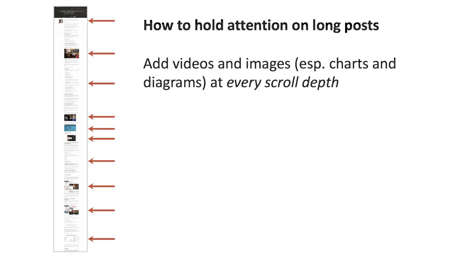So never write a paragraph longer than three lines. And, if possible, add an image at every scroll depth!"