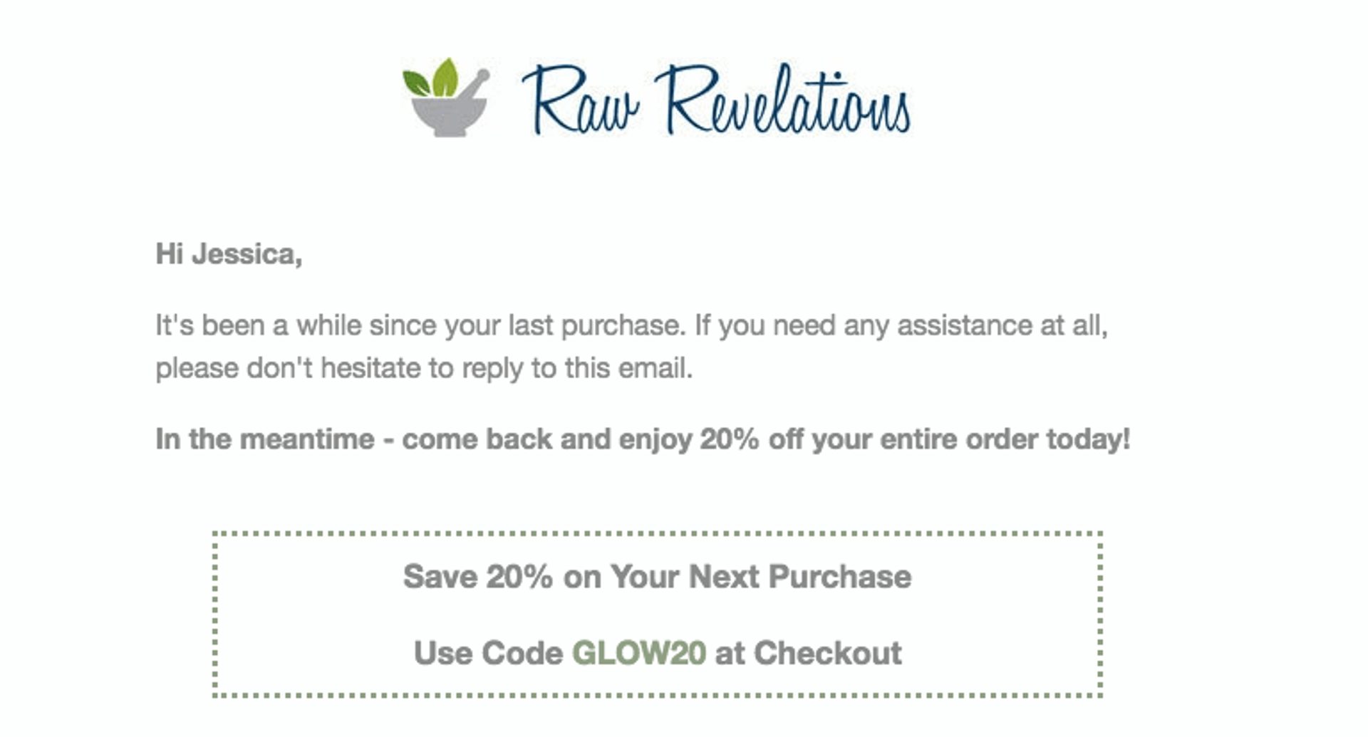 You also can offer incentives to existing customers. One month after my purchase at Raw Revelations, they sent me a 20% discount. This tactic worked because I forgot about Raw Revelations, and their discount was a friendly reminder to repurchase some products.