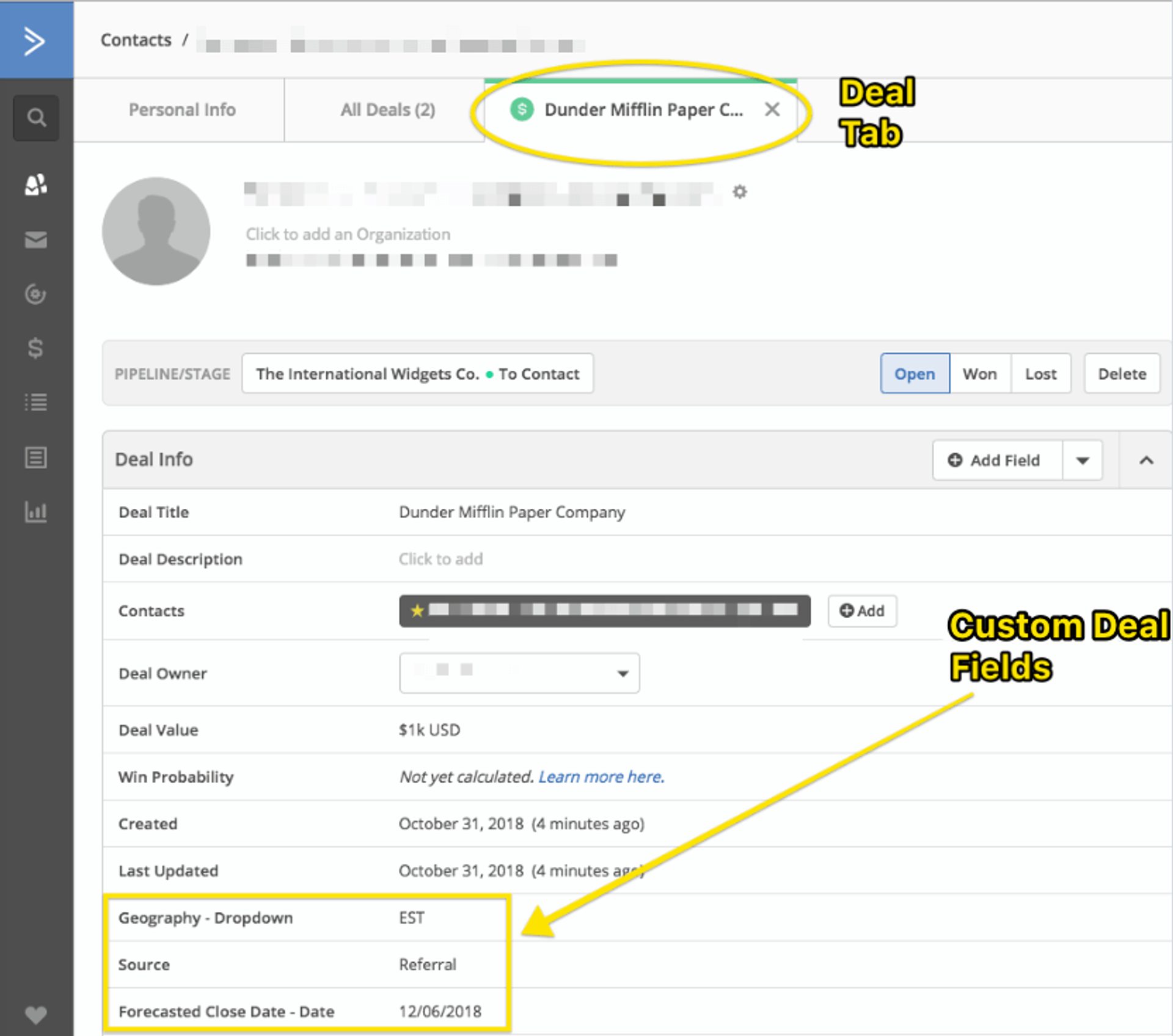 Custom deal fields are customizable category fields that help you keep all the information relevant to a deal in one place so it’s easily accessible. This enables you and other sales team members to easily review all the deal (AKA client) info, make decisions, and take action.