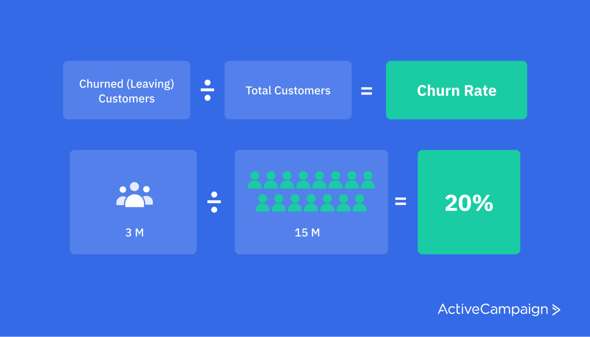This metric tells you how frequently customers leave. It’s the opposite of your retention rate. To calculate churn rate, divide the number of churned customers by your total number of customers.