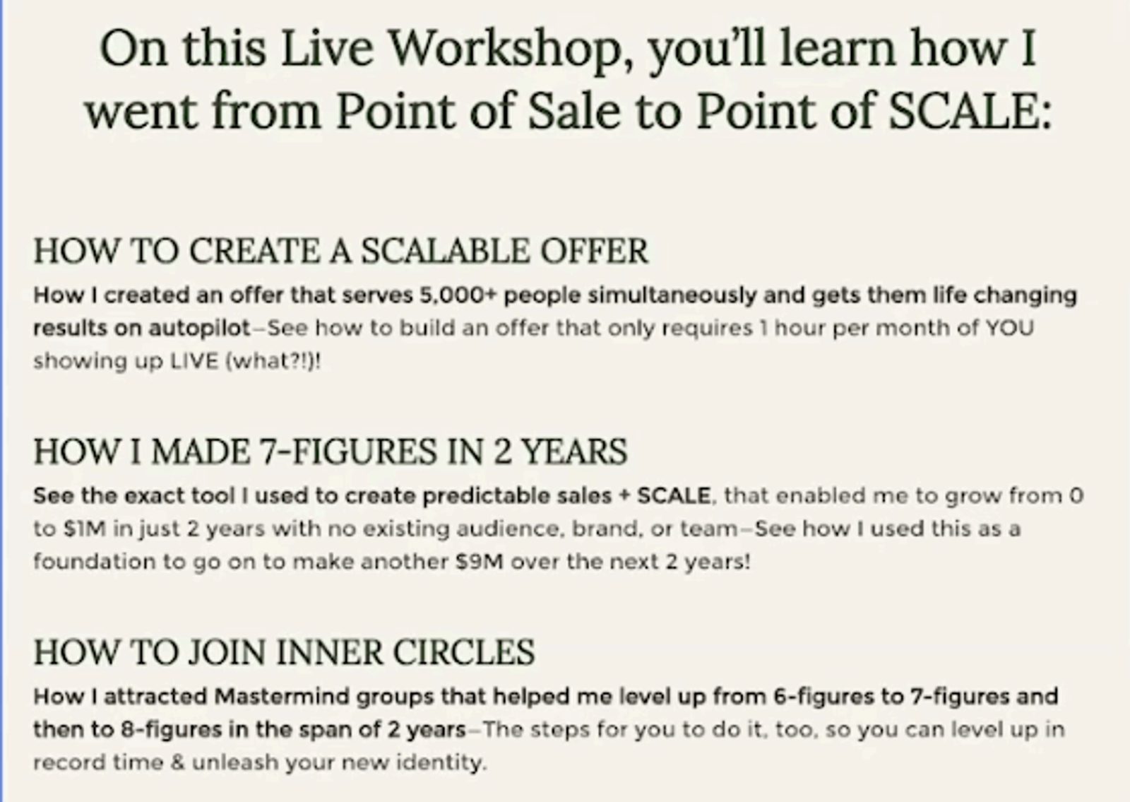 “The second piece, ‘see the exact tool to create predictable sales and scale that enabled me to grow from zero to a million.’ Again, incorporating your story and this moment into your talking points. And then the last one, ‘how I attracted mastermind groups that helped me level up from six to seven to eight figures, and the steps so you can do it too.’ So everything we're doing here is all about action steps,” notes Danielle.