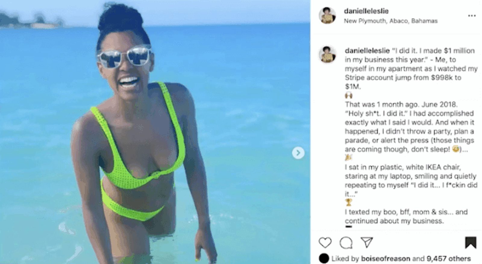 The first thing you want to do is find a story. It can be a struggle story. It can be your ‘I made it’ moment. And it doesn't have to be about making money. Maybe you were the first to graduate from college or the first in your family to start a business. Whatever that thing is, tell the story of it.“This is my most popular organic post, from when I first crossed a million dollars in my business. That year I did about a million dollars in 6 months. And so this is me just telling that story.”