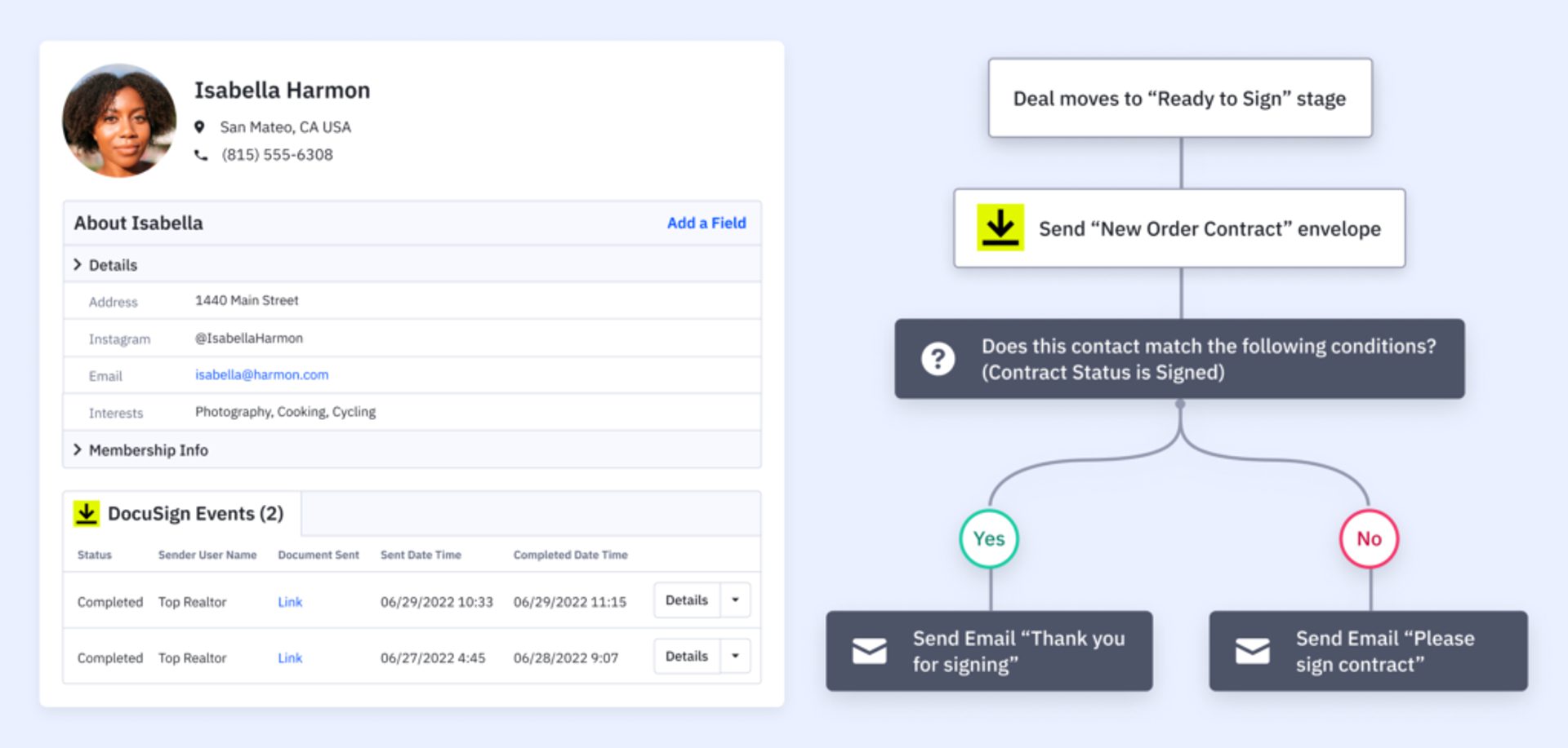 | Use case example: Automatically create DocuSign or Dropbox Sign documents and contracts when prospects reach relevant ActiveCampaign Deal stages in the CRM. This allows your sales team to increase efficiency and provides a more seamless customer experience. |